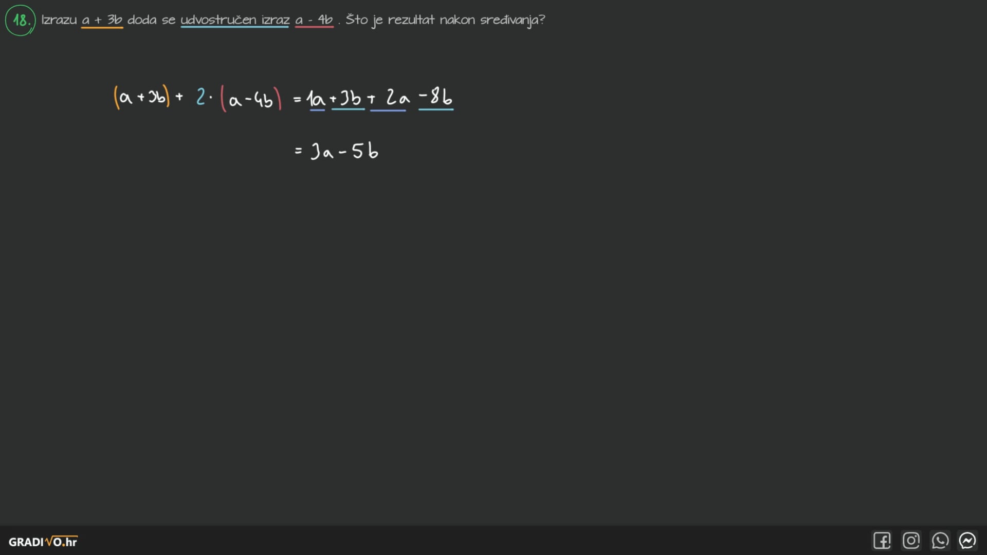 Izrazu $a+3 b$ doda se udvostručen izraz $a-4 b$. Što je rezultat nakon sređivanja?