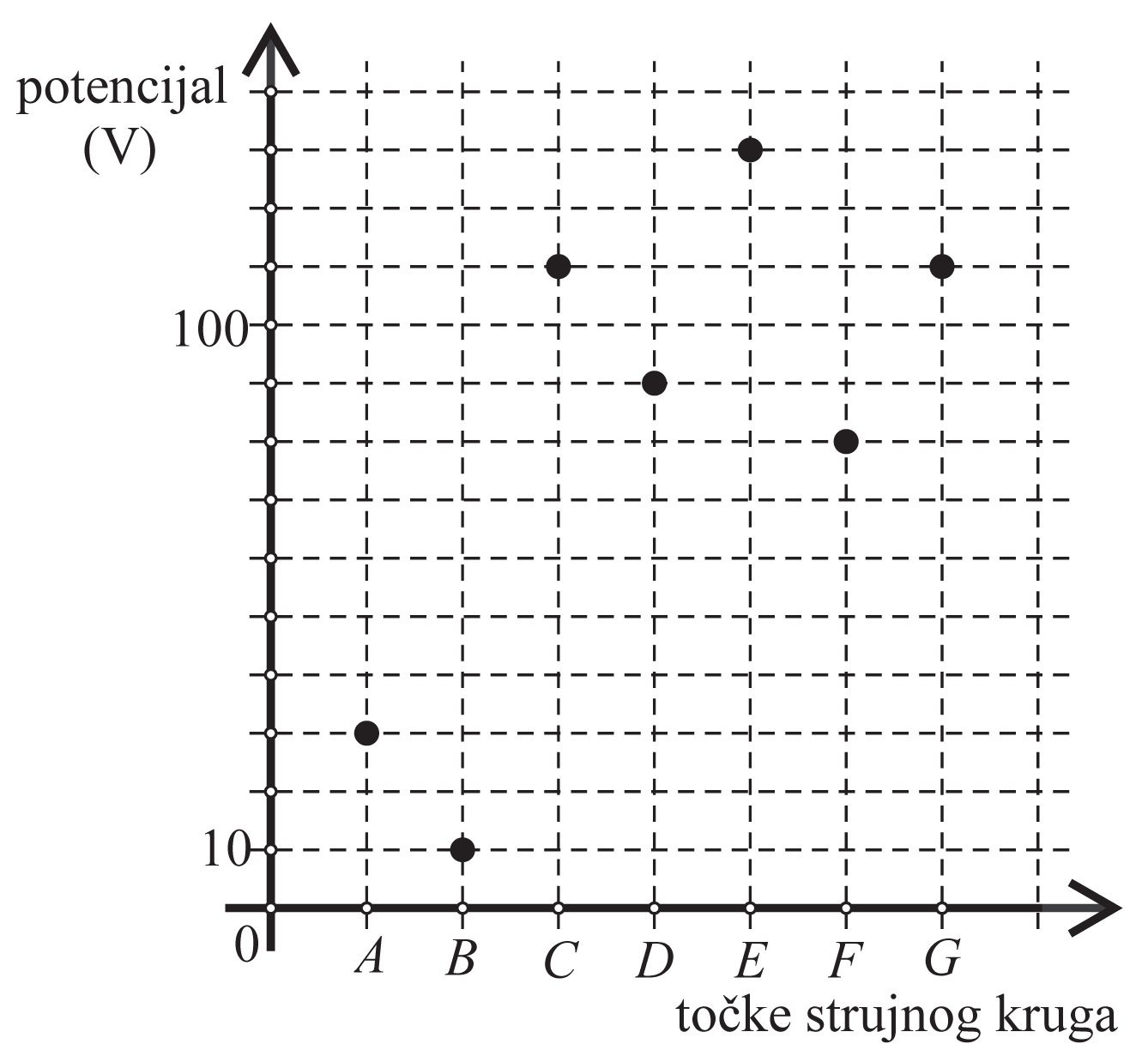 Na dijagramu na osi $x$ prikazane su točke strujnog kruga $A, B, C, D, E, F$ i $G$, a na osi $y$ prikazani su potencijali u tim točkama izraženi u voltima (V).