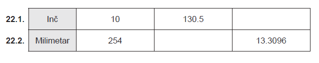 Sljedeća tablica povezuje duljine izražene u inčima i milimetrima.Popunite vrijednosti koje nedostaju.