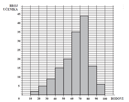 Na slici su prikazani rezultati pismenoga ispita u nekoj školi. Pravokutnik na intervalu od 10 do 20 bodova predočuje da su 2 učenika imala više od 10, a manje ili jednako 20 bodova, a primjerice, pravokutnik na intervalu od 40 do 50 bodova predočuje da je 15 učenika imalo više od 40, a manje ili jednako 50 bodova.