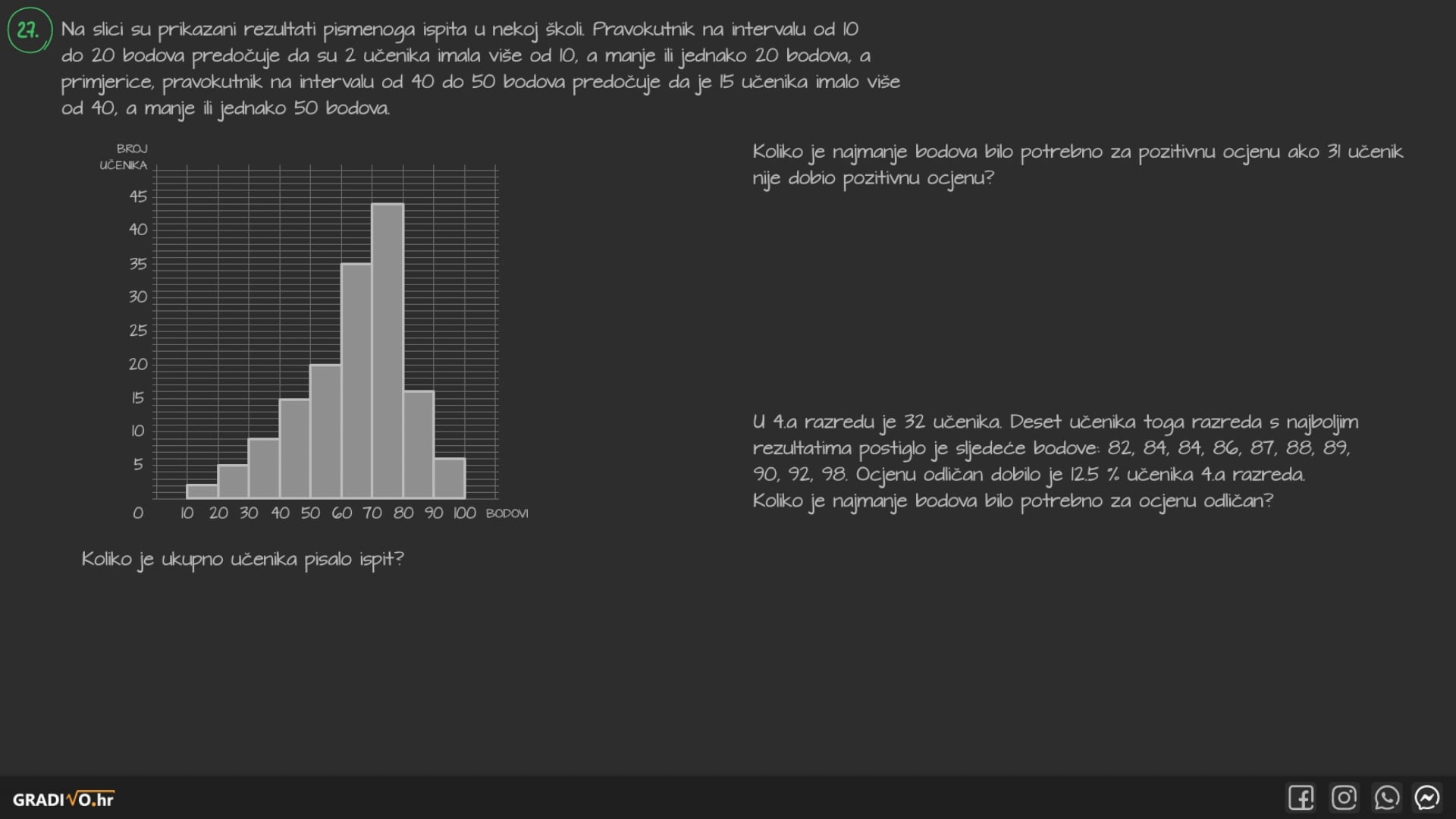 27.2. Koliko je najmanje bodova bilo potrebno za pozitivnu ocjenu ako 31 učenik nije dobio pozitivnu ocjenu?