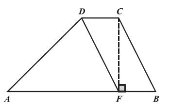 U četverokutu $A B C D$, prikazanome na slici, stranica $\overline{A B}$ paralelna je sa stranicom $\overline{C D}$, a stranica $\overline{B C}$ paralelna je sa stranicom $\overline{D F}$, s time da je zadano $|A B|=4.5 \mathrm{~cm}$, $|F B|=1.3 \mathrm{~cm},|F C|=2|F B|$ i $\angle C F B=90^{\circ}$.