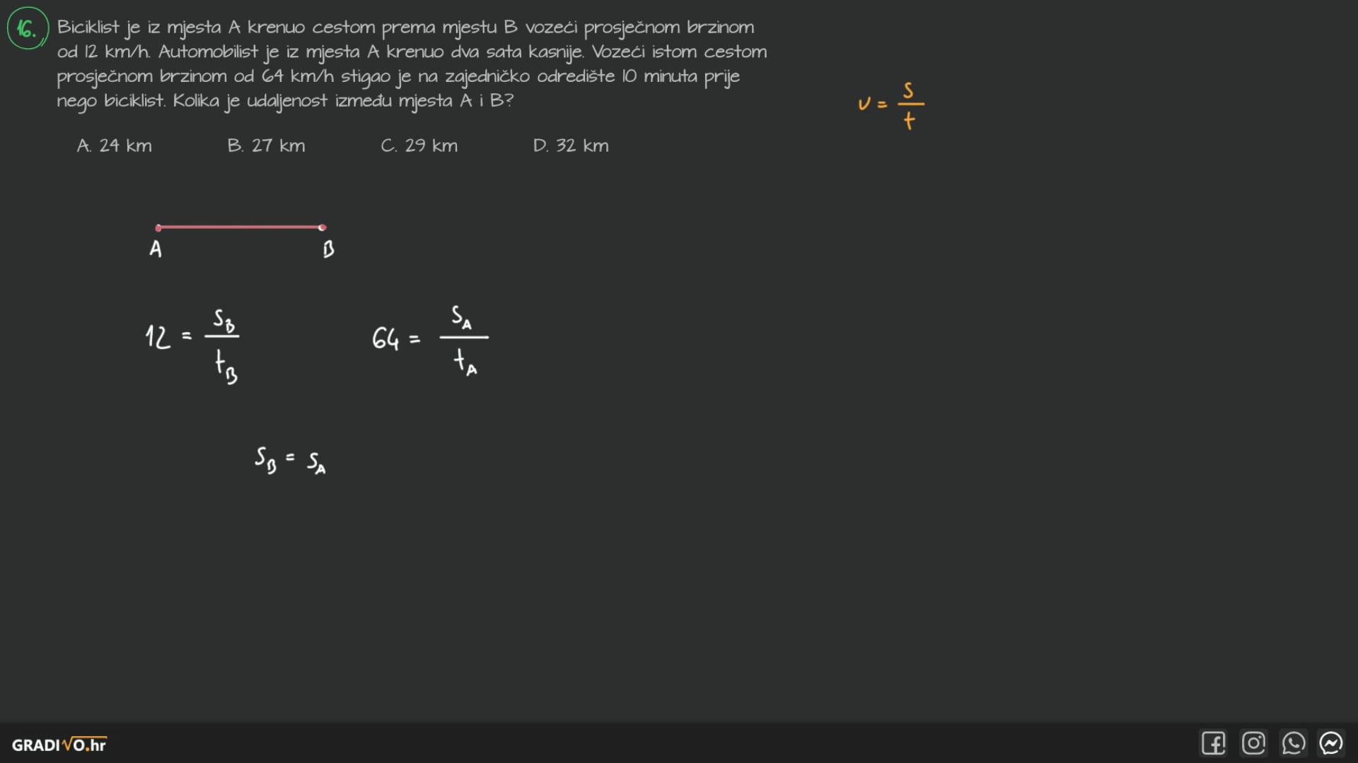 Biciklist je iz mjesta A krenuo cestom prema mjestu B vozeći prosječnom brzinom od 12 km/h. Automobilist je iz mjesta A krenuo dva sata kasnije. Vozeći istom cestom prosječnom brzinom od 64 km/h stigao je na zajedničko odredište 10 minuta prije nego biciklist. Kolika je udaljenost između mjesta A i B?