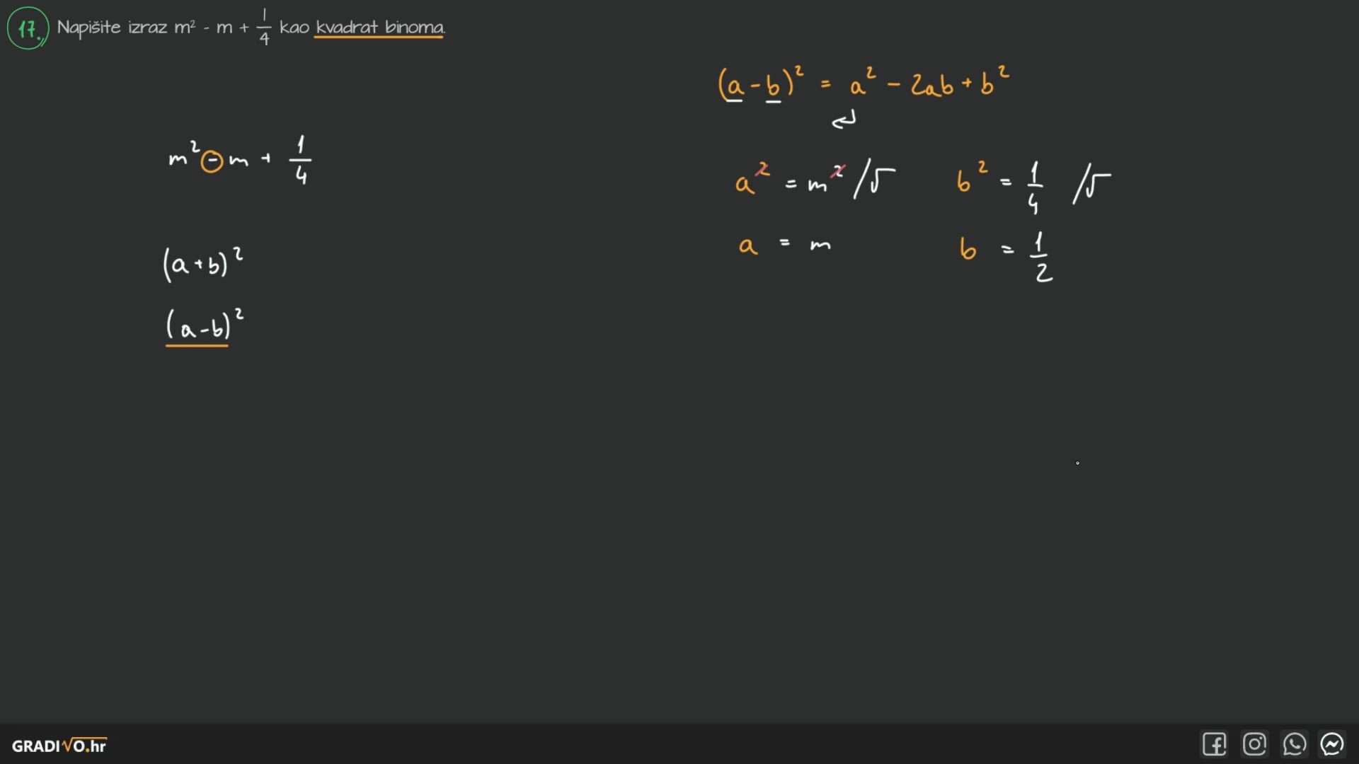 Napišite izraz $m^{2}-m+\frac{1}{4}$ kao kvadrat binoma.
