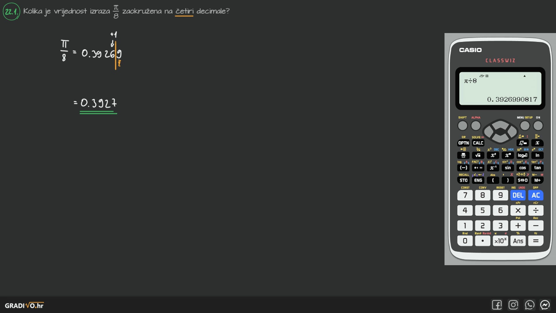 Kolika je vrijednost izraza $\frac{\pi}{8}$ zaokružena na četiri decimale?