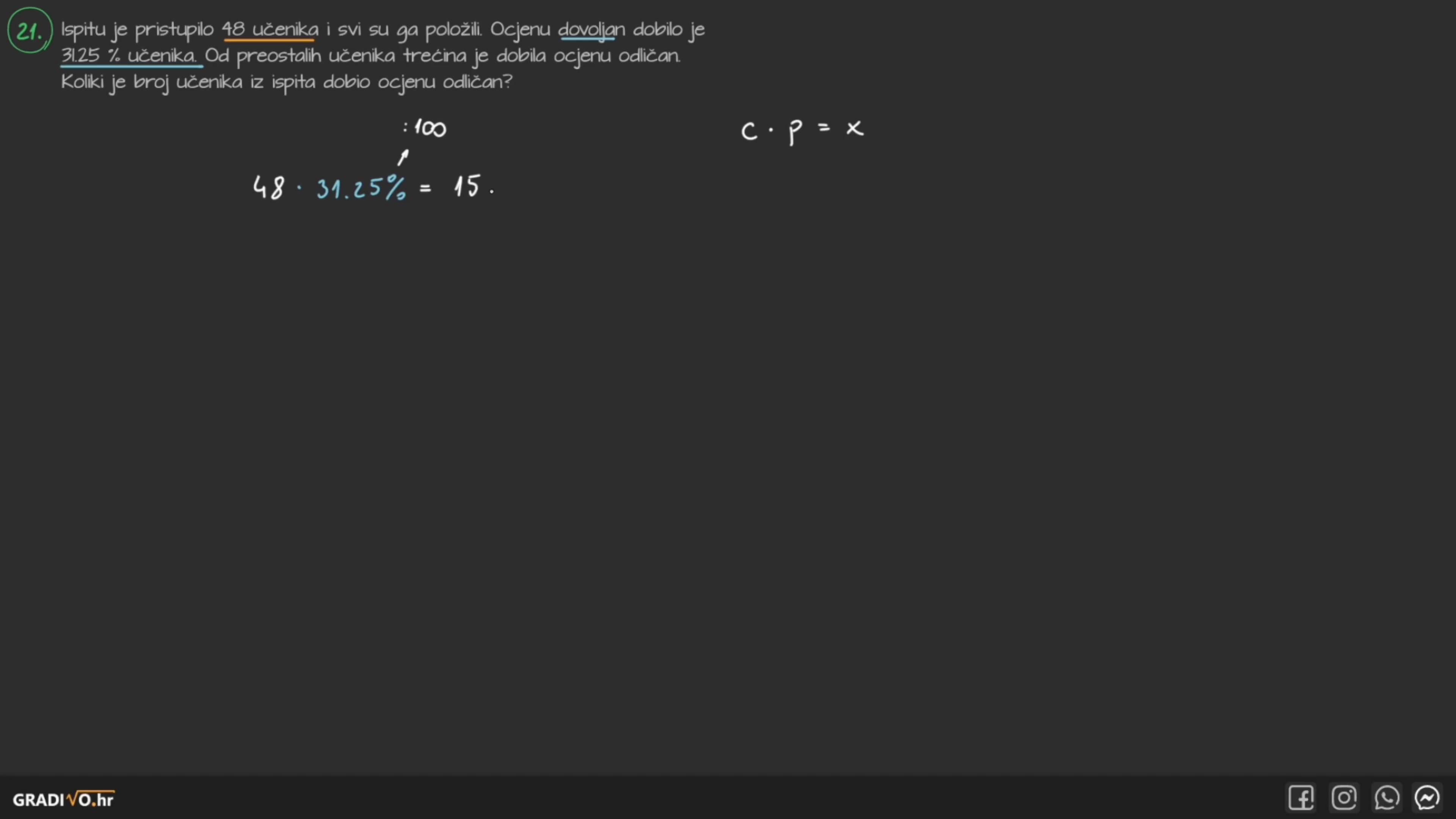 Ispitu je pristupilo 48 učenika i svi su ga položili. Ocjenu dovoljan dobilo je 31.25% učenika. Od preostalih učenika trećina je dobila ocjenu odličan. Koliki je broj učenika iz ispita dobio ocjenu odličan?
