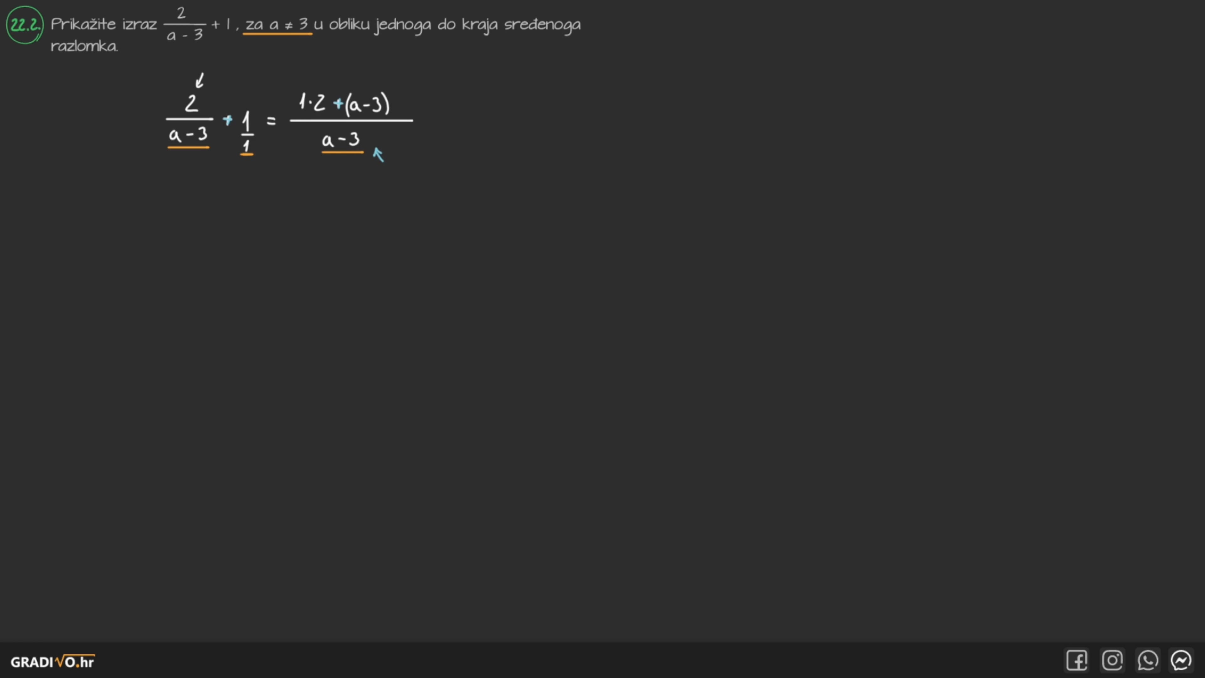 Prikažite izraz $\frac{2}{a-3}+1$, za $a \neq 3$ u obliku jednoga do kraja sređenoga razlomka.