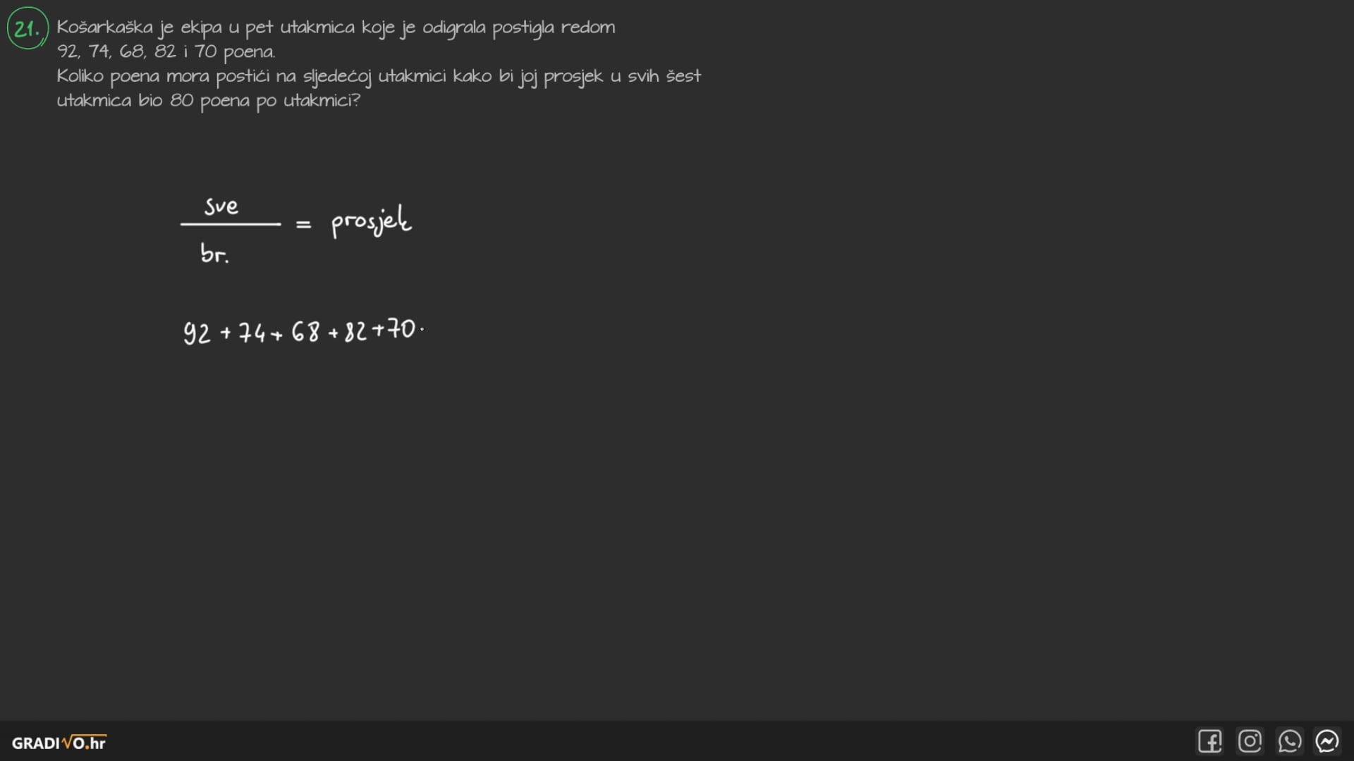 Košarkaška je ekipa u pet utakmica koje je odigrala postigla redom $92,74,68,82$ i 70 poena. Koliko poena mora postići na sljedećoj utakmici kako bi joj prosjek u svih šest utakmica bio 80 poena po utakmici?
