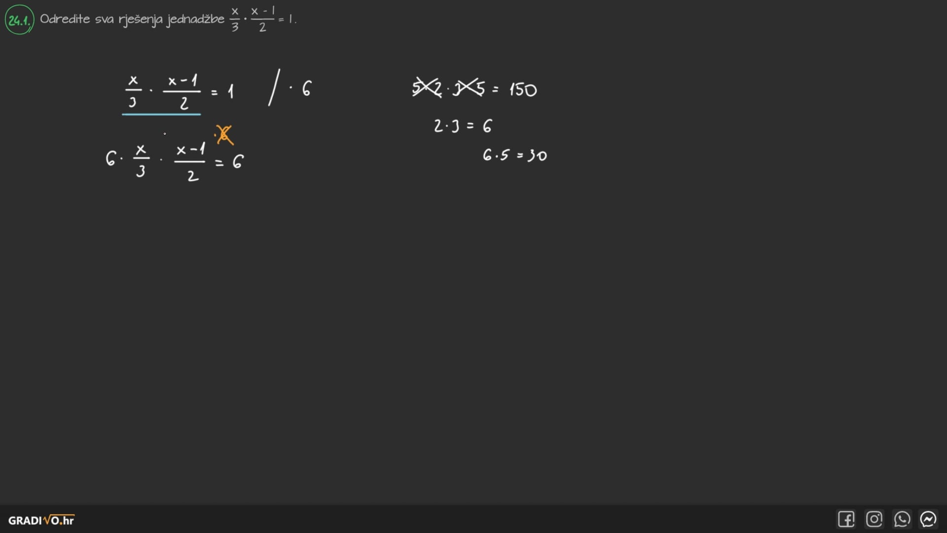 Odredite sva rješenja jednadžbe $\frac{x}{3} \cdot \frac{x-1}{2}=1$.