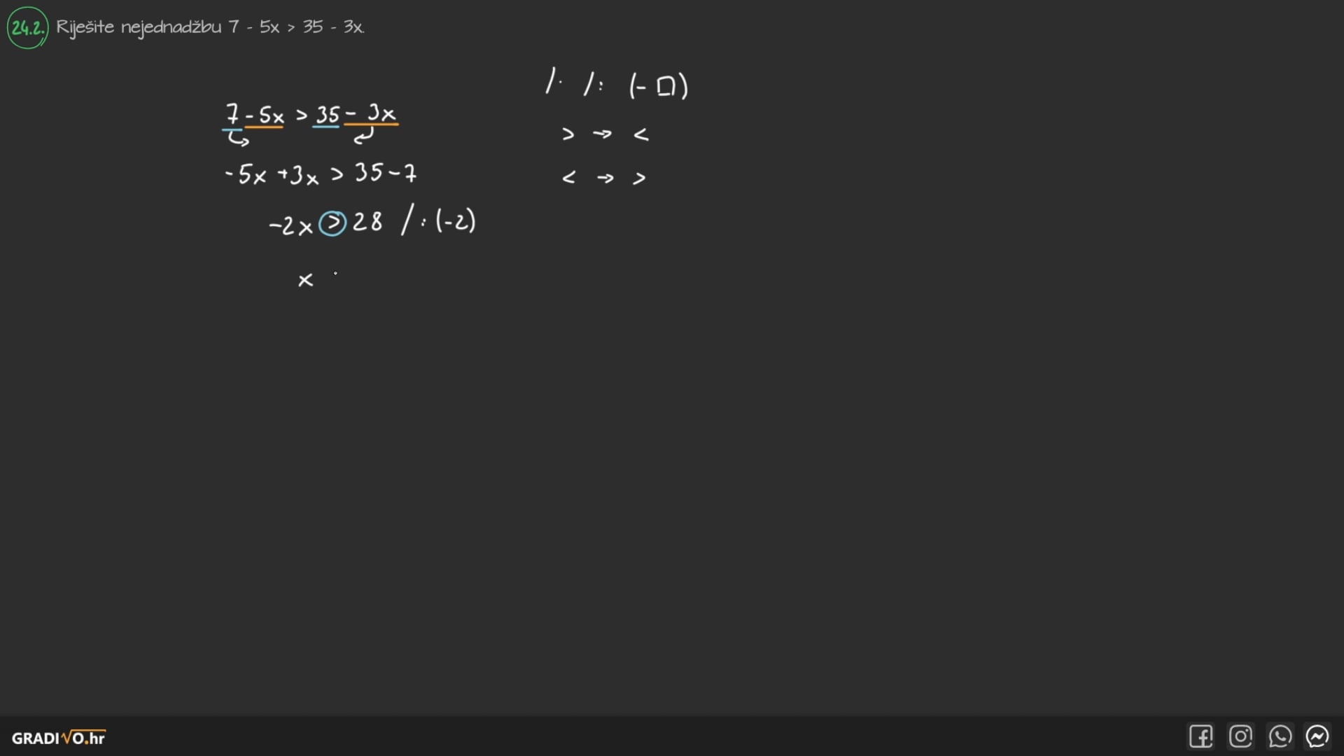Riješite nejednadžbu $7-5 x>35-3 x$.