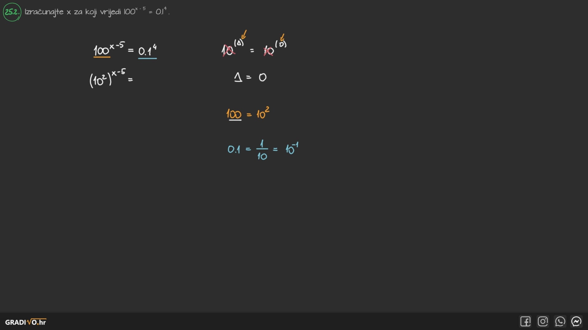 Izračunajte $x$ za koji vrijedi $100^{x-5}=0.1^{4}$.