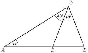 Na skici je prikazan trokut $A B C$ i na stranici $\overline{A B}$ istaknuta je točka $D$ tako da je $|B C|=|C D|$. Odredite mjeru kuta $\alpha$ toga trokuta.