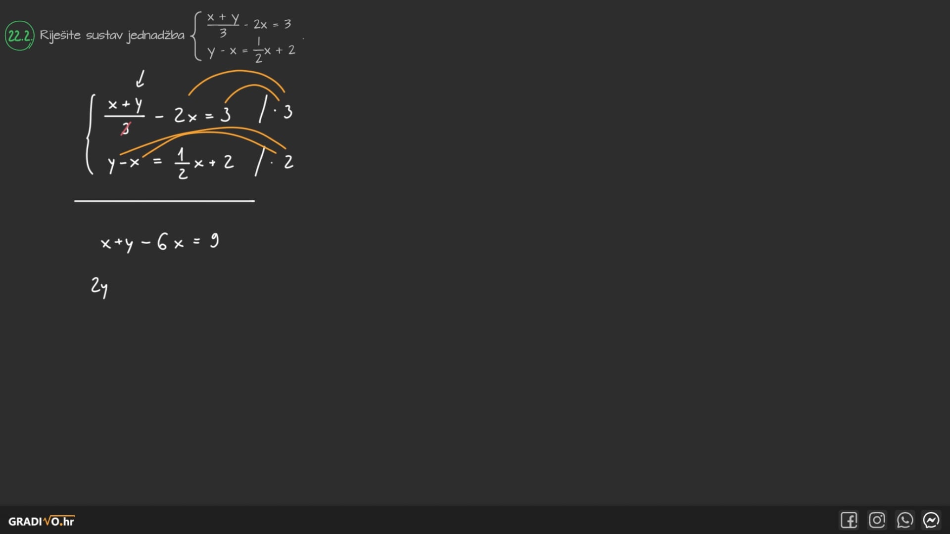 Riješite sustav jednadžba $\left\{\begin{array}{l}\frac{x+y}{3}-2 x=3 \\ y-x=\frac{1}{2} x+2\end{array}\right.$.