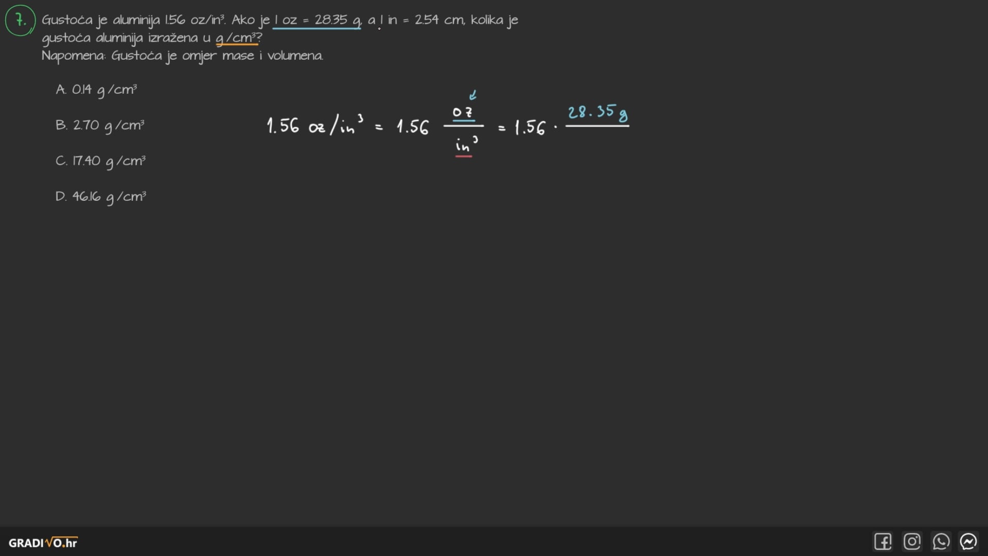 Gustoća je aluminija $1.56 \mathrm{oz} / \mathrm{in}^{3}$. Ako je $1 \mathrm{oz}=28.35 \mathrm{~g}$, a $1 \mathrm{in}=2.54 \mathrm{~cm}$, kolika je gustoća aluminija izražena u $\mathrm{g} / \mathrm{cm}^{3}$ ?