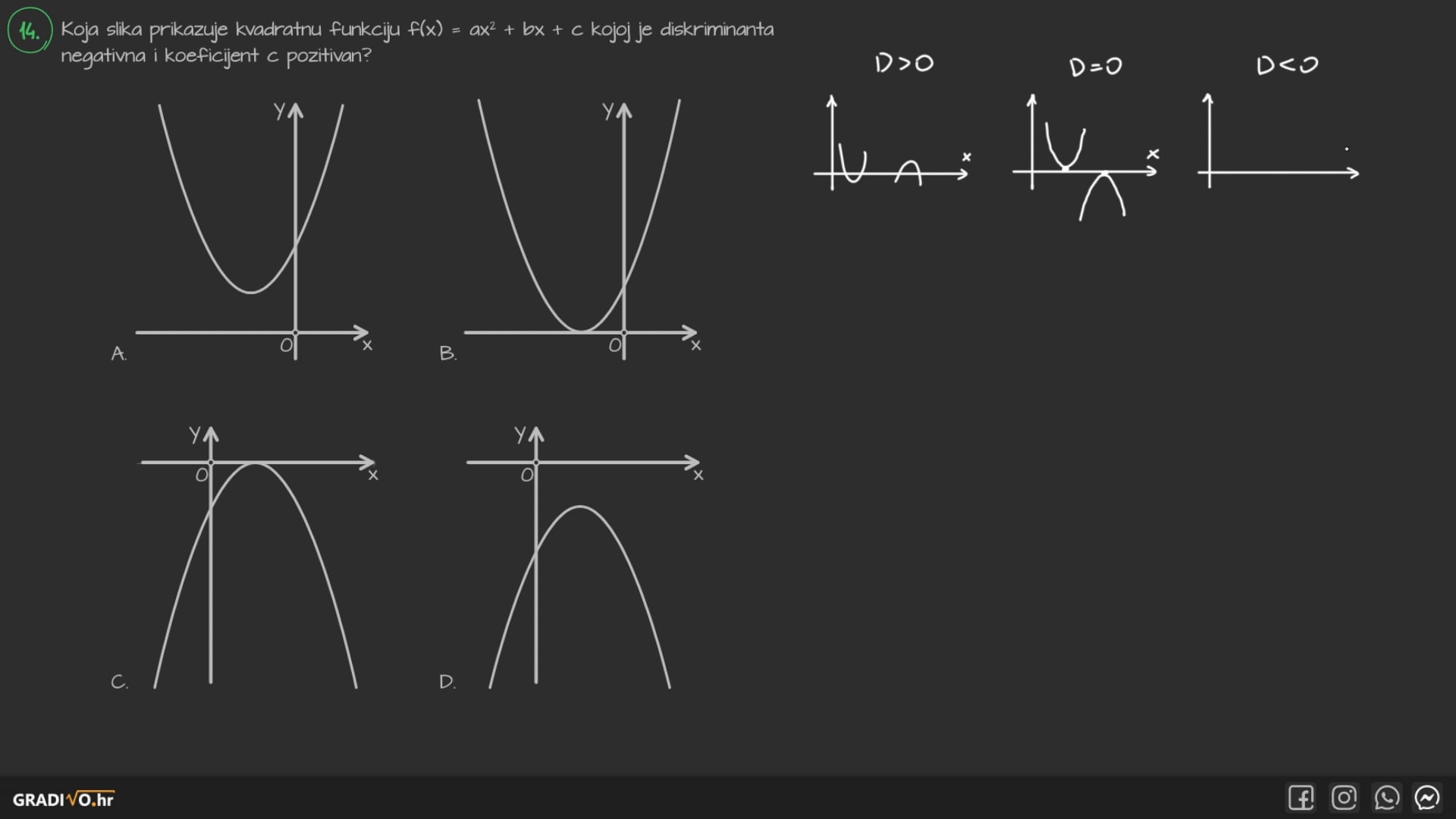 Koja slika prikazuje kvadratnu funkciju $f(x)=a x^{2}+b x+c$ kojoj je diskriminanta negativna i koeficijent $c$ pozitivan?