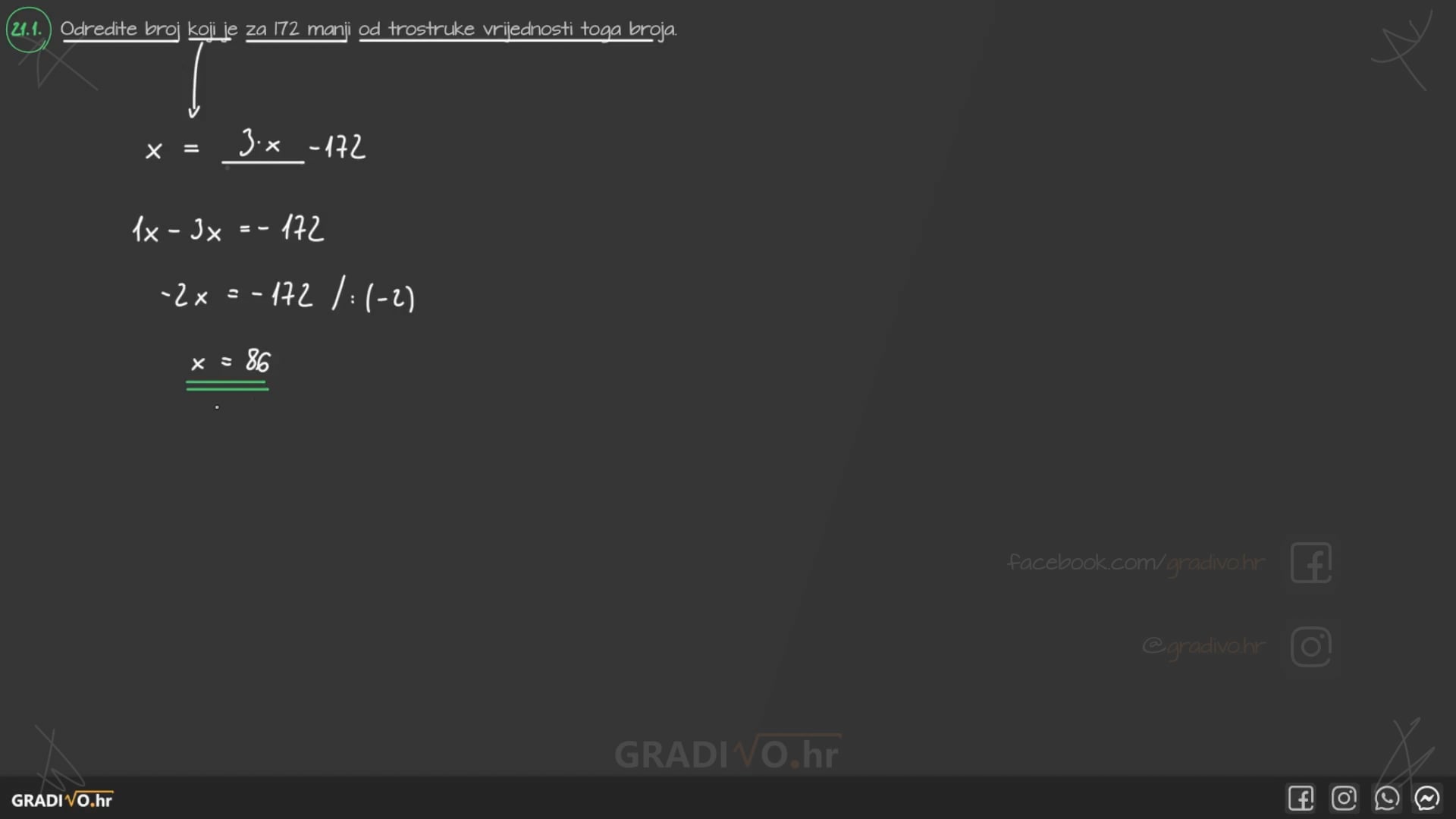 Odredite broj koji je za 172 manji od trostruke vrijednosti toga broja.