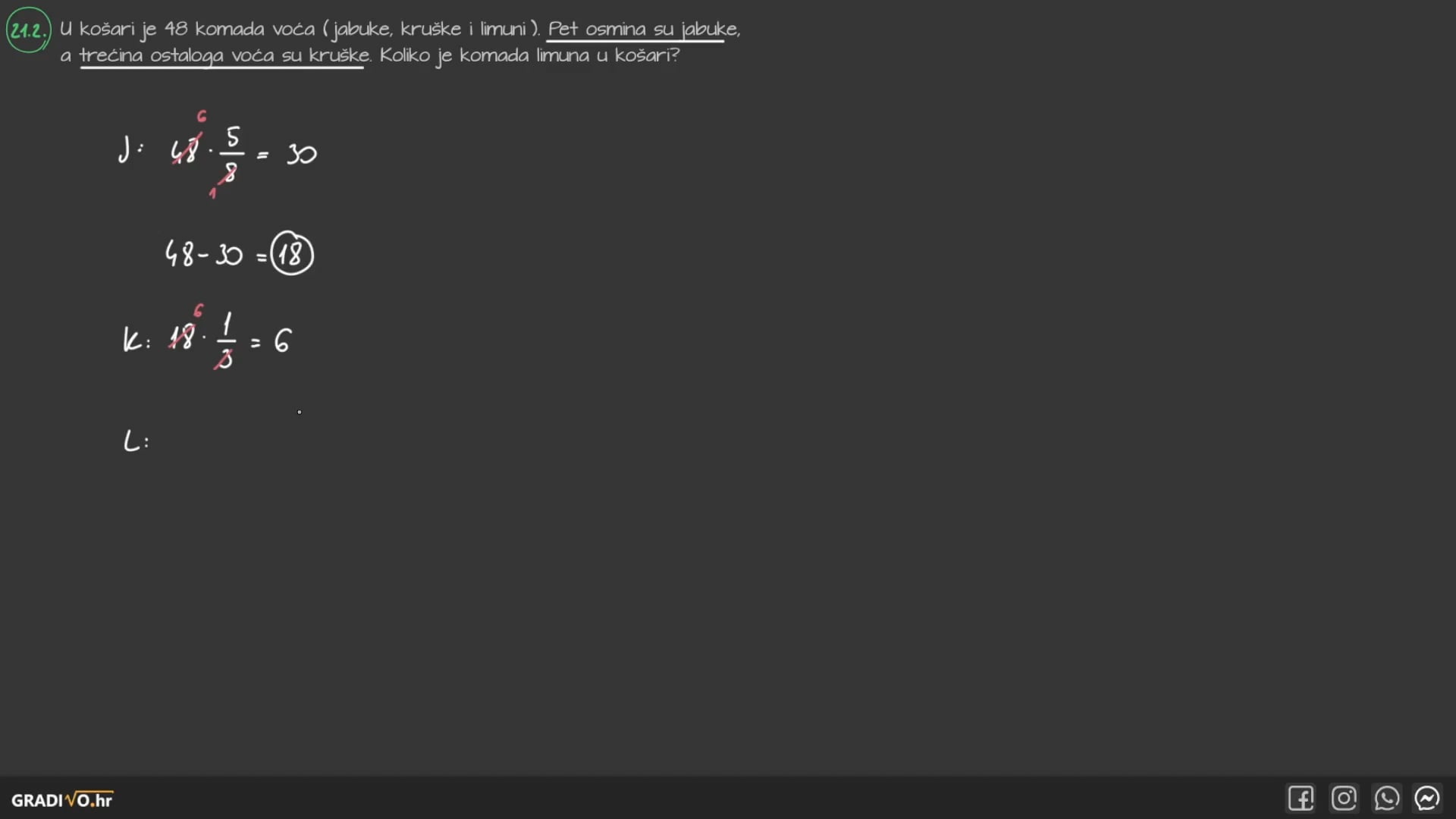 U košari je 48 komada voća (jabuke, kruške i limuni). Pet osmina su jabuke, a trećina ostaloga voća su kruške. Koliko je komada limuna u košari?