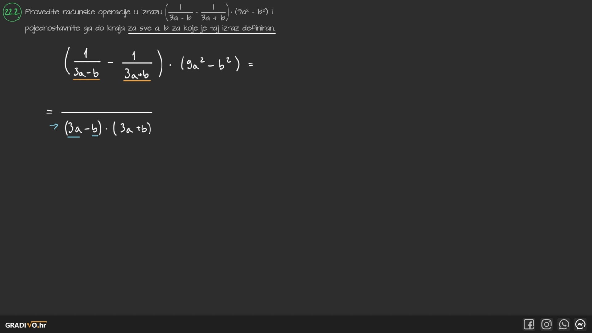Provedite računske operacije u izrazu $\left(\frac{1}{3 a-b}-\frac{1}{3 a+b}\right) \cdot\left(9 a^{2}-b^{2}\right)$ i pojednostavnite ga do kraja za sve $a, b$ za koje je taj izraz definiran.
