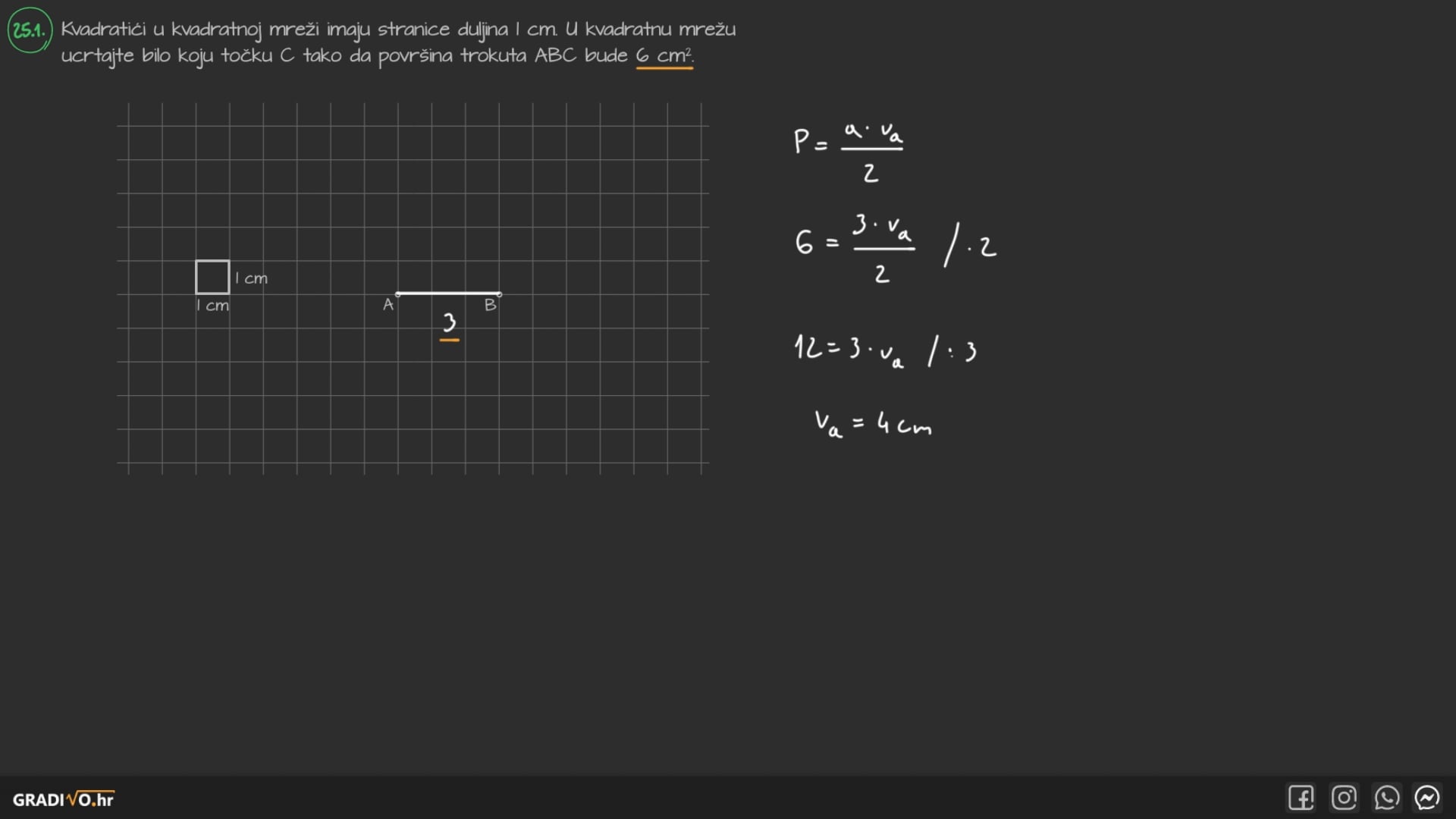 Kvadratići u kvadratnoj mreži imaju stranice duljina 1 cm . U kvadratnu mrežu ucrtajte bilo koju točku $C$ tako da površina trokuta $A B C$ bude $6 \mathrm{~cm}^{2}$.