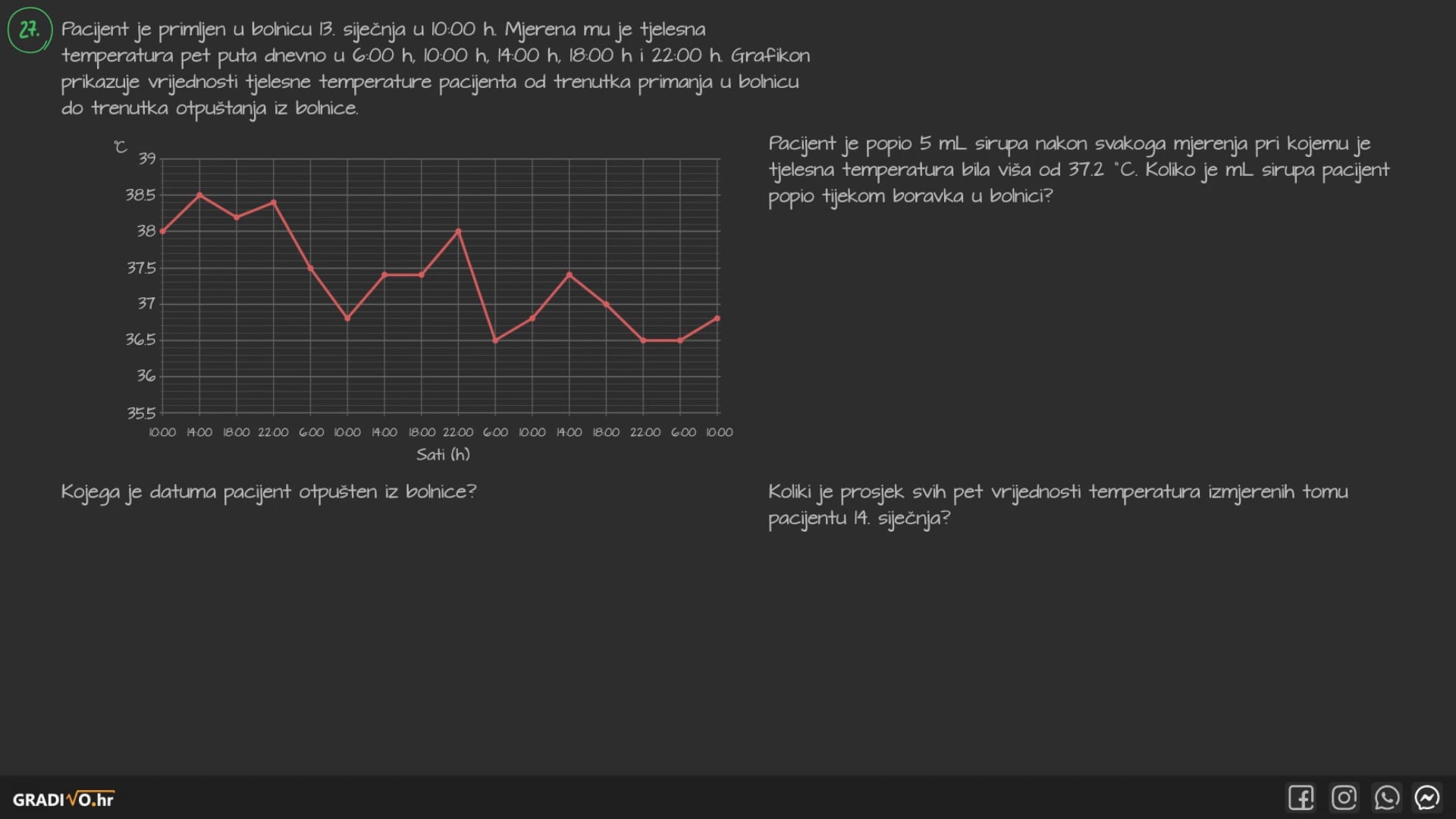 Pacijent je primljen u bolnicu 13. siječnja u 10:00 h. Mjerena mu je tjelesna temperatura pet puta dnevno u 6:00 h, 10:00 h, 14:00 h, 18:00 h i 22:00 h. Grafikon prikazuje vrijednosti tjelesne temperature pacijenta od trenutka primanja u bolnicu do trenutka otpuštanja iz bolnice.