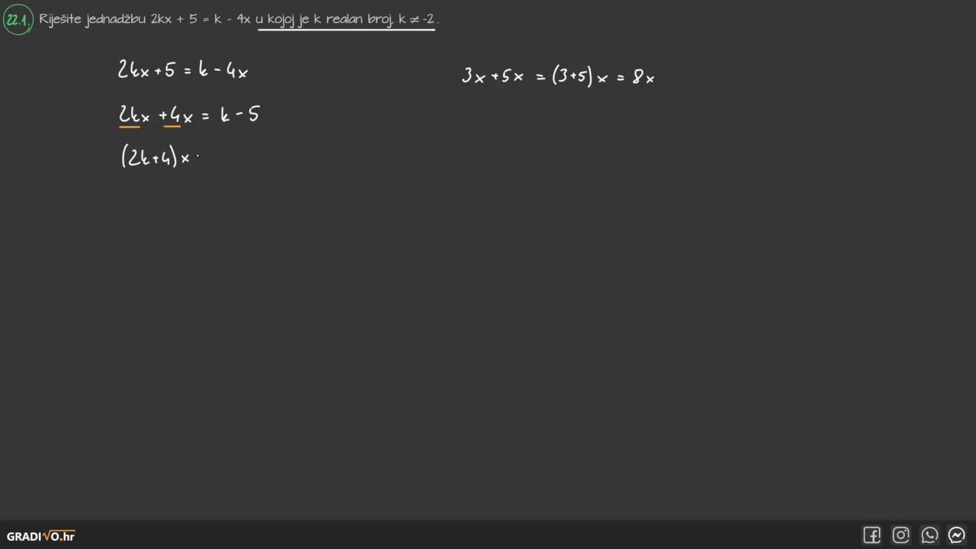 Riješite jednadžbu $2 k x+5=k-4 x$ u kojoj je $k$ realan broj, $k \neq-2$.