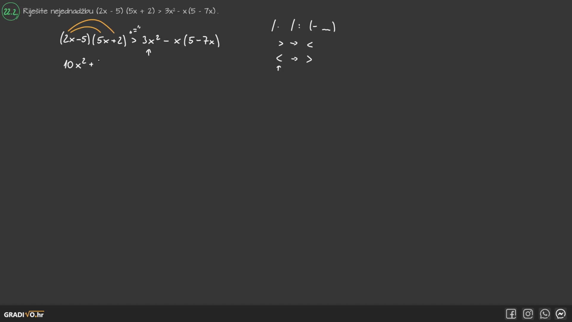 Riješite nejednadžbu $(2 x-5)(5 x+2)>3 x^{2}-x(5-7 x)$.