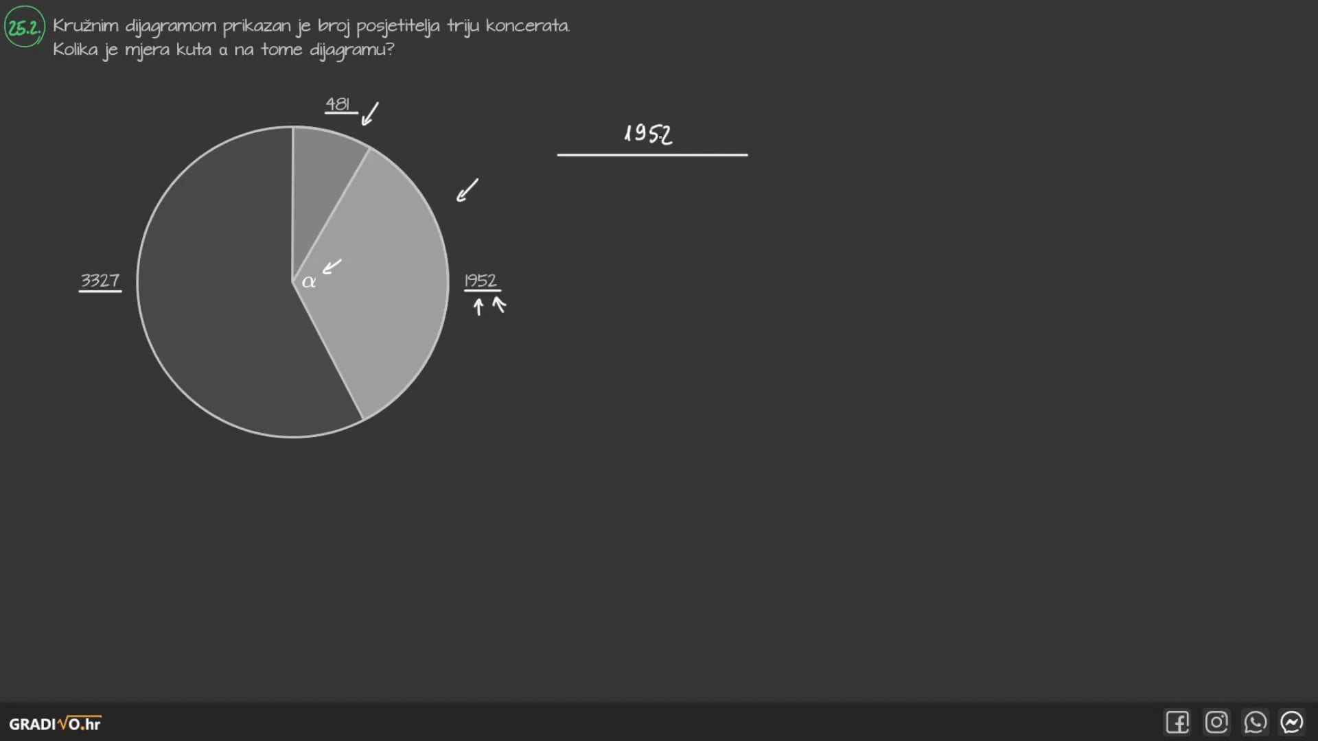 Kružnim dijagramom prikazan je broj posjetitelja triju koncerata.Kolika je mjera kuta $\alpha$ na tome dijagramu?