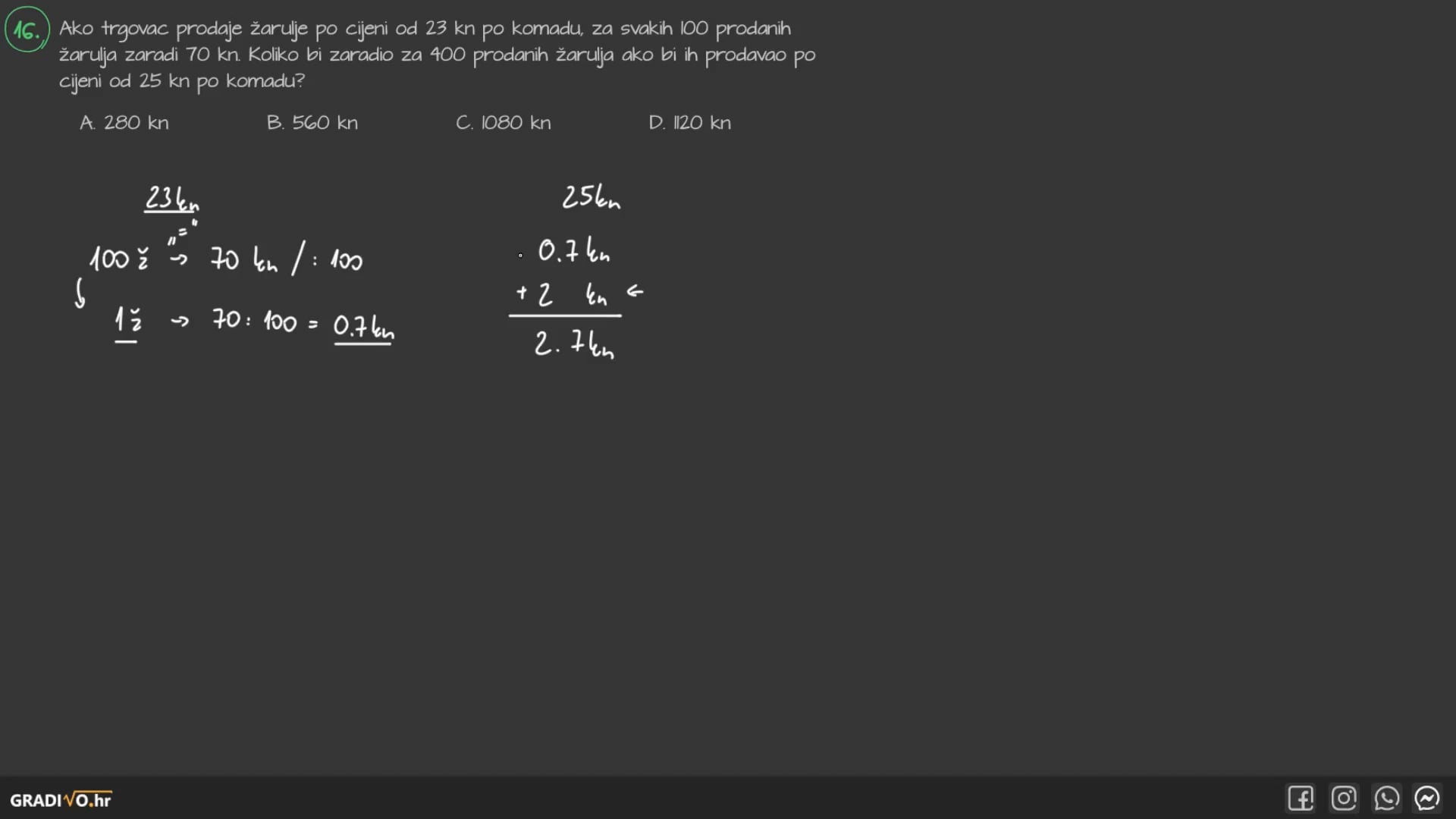 Ako trgovac prodaje žarulje po cijeni od 23 kn po komadu, za svakih 100 prodanih žarulja zaradi 70 kn . Koliko bi zaradio za 400 prodanih žarulja ako bi ih prodavao po cijeni od 25 kn po komadu?