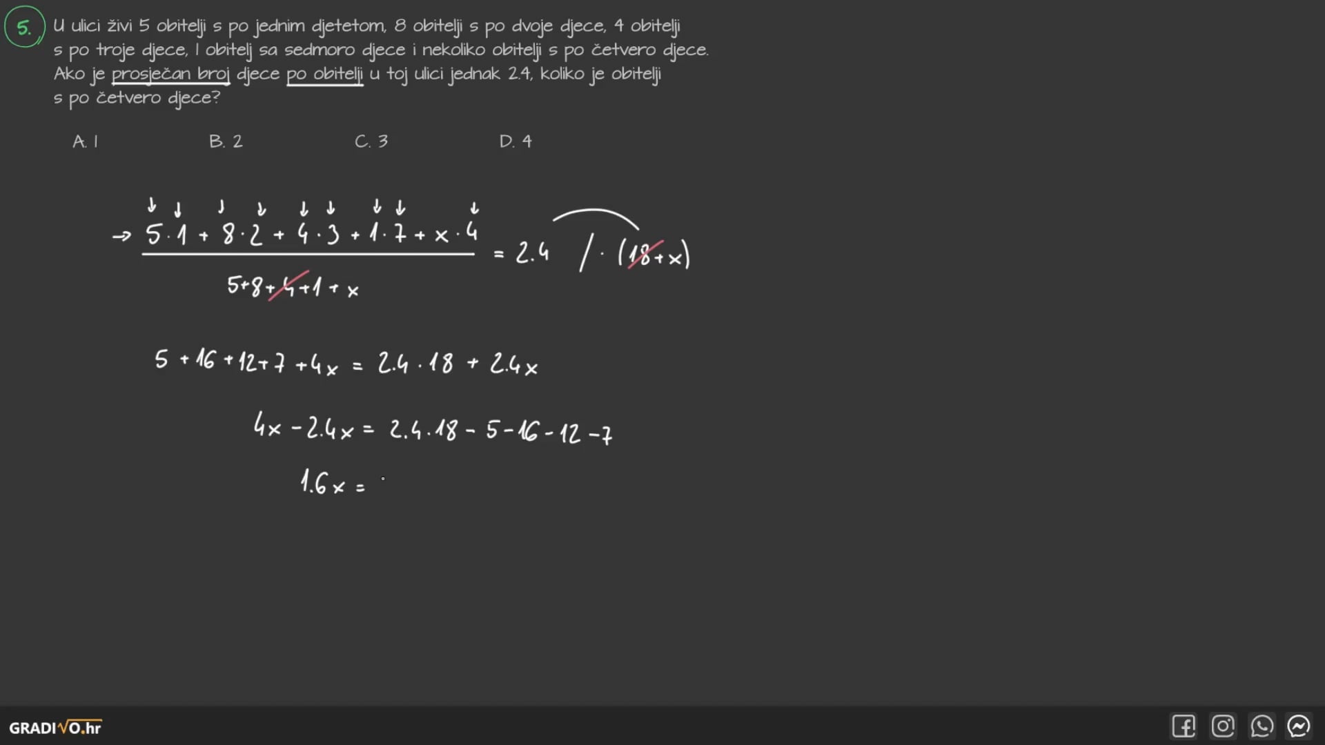 U ulici živi 5 obitelji s po jednim djetetom, 8 obitelji s po dvoje djece, 4 obitelji s po troje djece, 1 obitelj sa sedmoro djece i nekoliko obitelji s po četvero djece. Ako je prosječan broj djece po obitelji u toj ulici jednak 2.4, koliko je obitelji s po četvero djece?