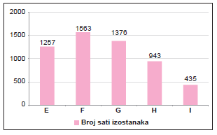Na grafikonu je prikazan ukupan broj izostanaka u nekoj školi tijekom školske godine za pet razrednih odjela 𝐸, 𝐹, 𝐺, 𝐻 i I.