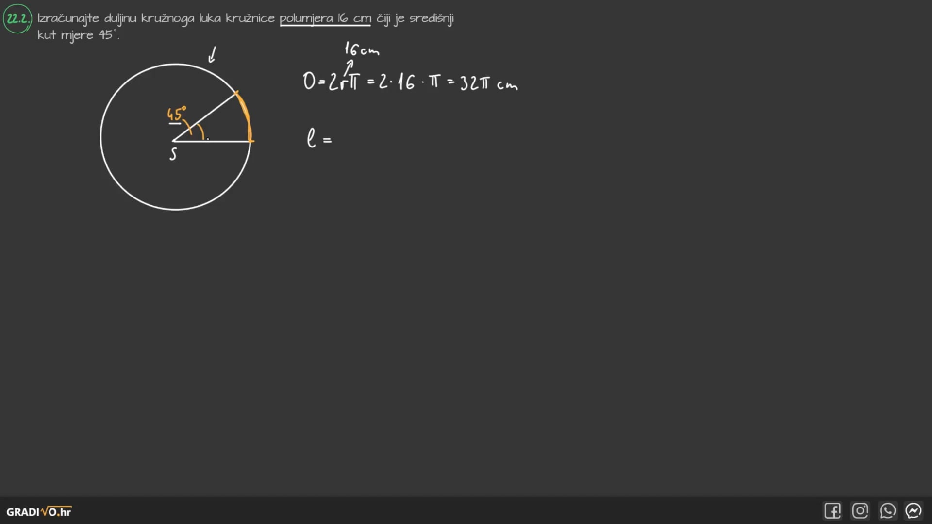 Izračunajte duljinu kružnoga luka kružnice polumjera 16 cm čiji je središnji kut mjere 45°.