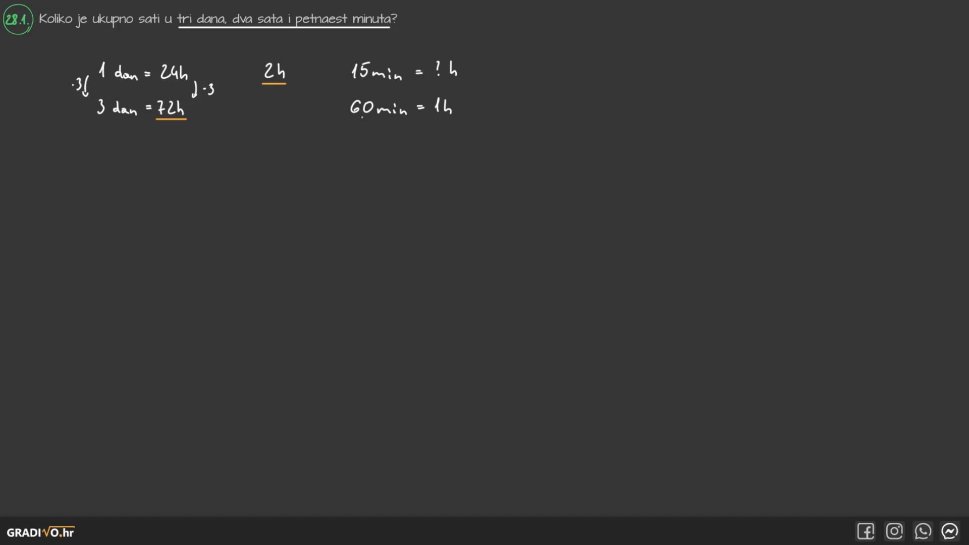 Koliko je ukupno sati u tri dana, dva sata i petnaest minuta?