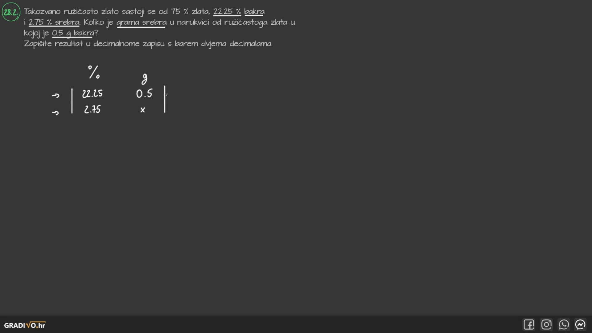 Takozvano rużičasto zlato sastoji se od $75 \%$ zlata, $22.25 \%$ bakra i $2.75 \%$ srebra. Koliko je grama srebra u narukvici od ružićastoga zlata u kojoj je 0.5 g bakra? Zapišite rezultat u decimalnome zapisu s barem dvjema decimalama.