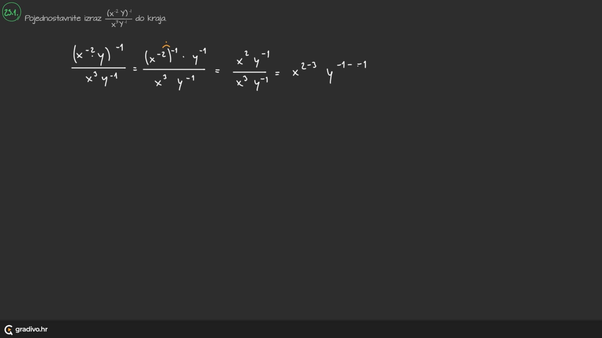 Pojednostavnite izraz $\frac{\left(x^{-2} y\right)^{-1}}{x^{3} y^{-1}}$ do kraja.