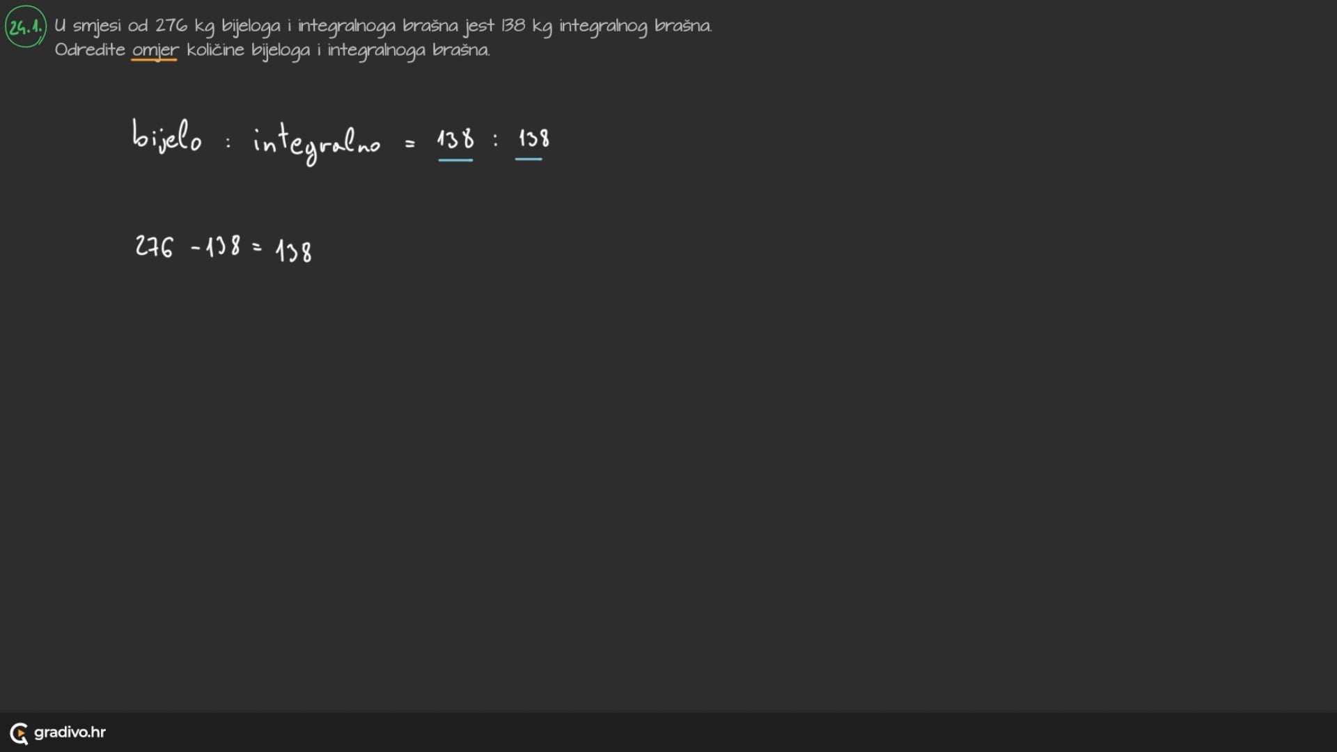 U smjesi od 276 kg bijeloga i integralnoga brašna jest 138 kg integralnog brašna. Odredite omjer količine bijeloga i integralnoga brašna.