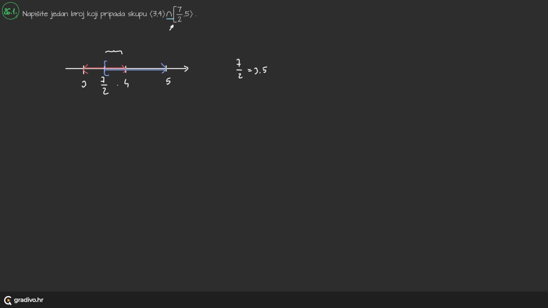 Napišite jedan broj koji pripada skupu $\langle 3,4\rangle \cap\left[\frac{7}{2}, 5\right\rangle$.