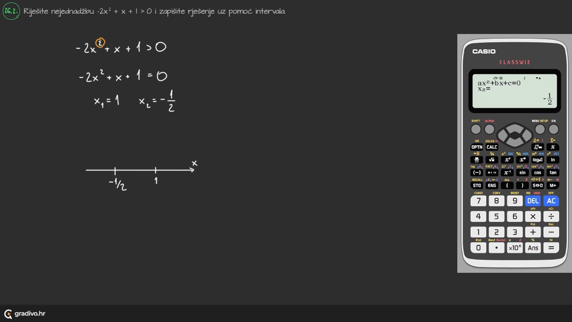 Riješite nejednadžbu $-2 x^{2}+x+1>0$ i zapišite rješenje uz pomoć intervala.