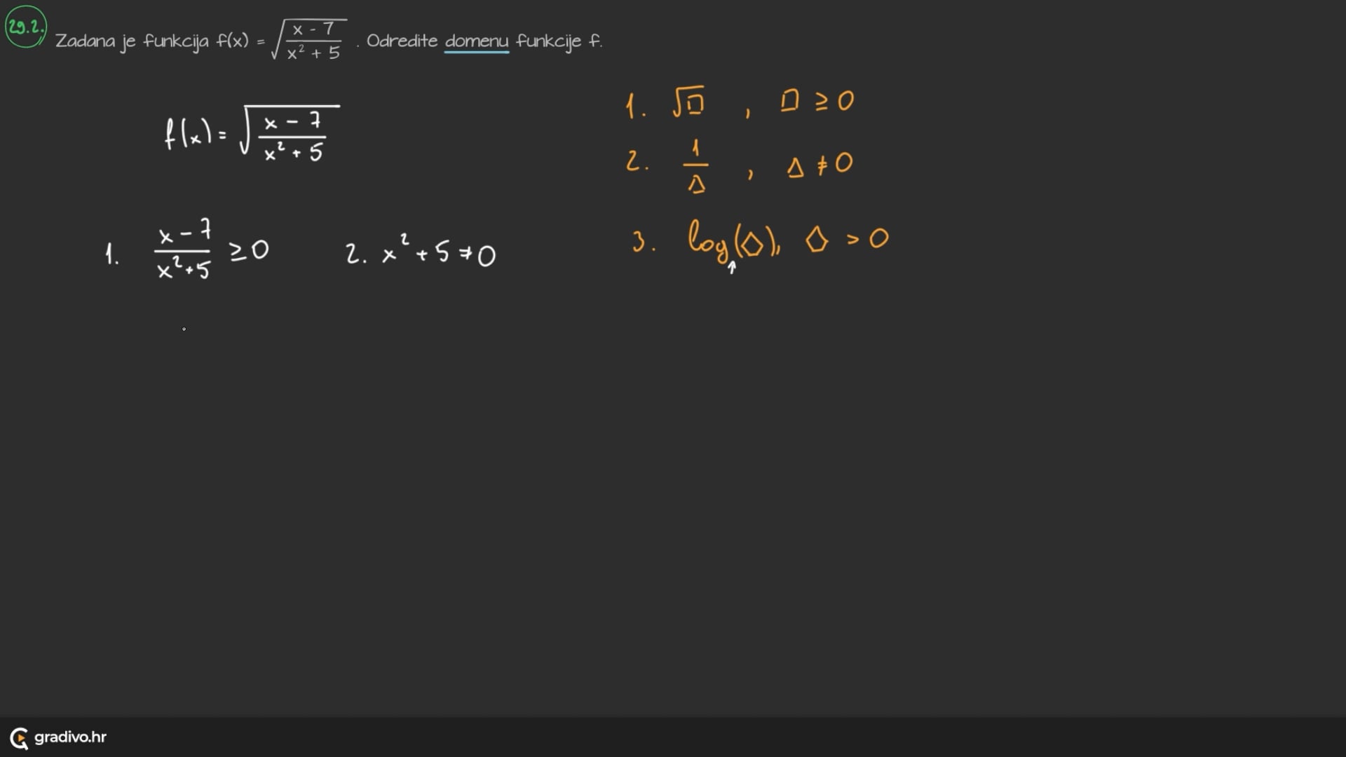 Zadana je funkcija $f(x)=\sqrt{\frac{x-7}{x^{2}+5}}$. Odredite domenu funkcije $f$.