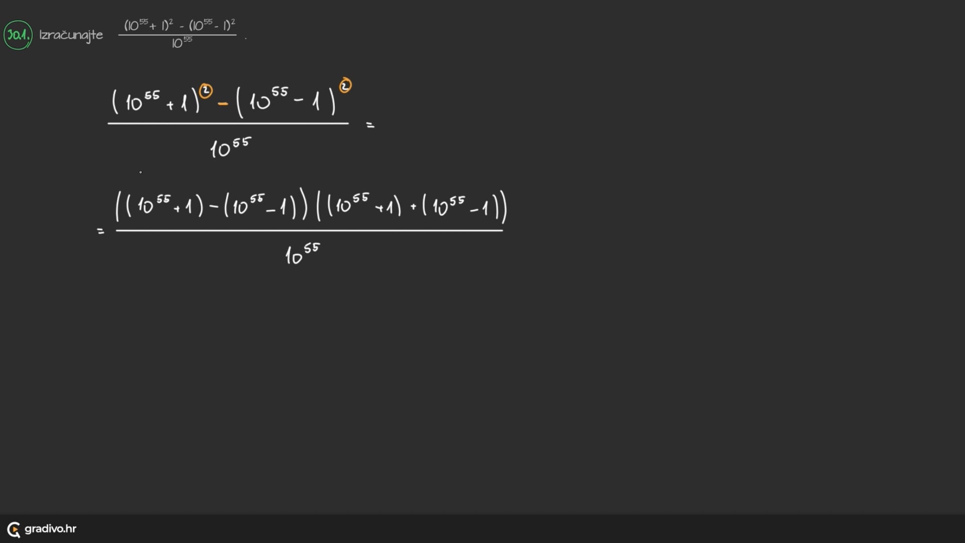 Izračunajte $\frac{\left(10^{55}+1\right)^{2}-\left(10^{55}-1\right)^{2}}{10^{55}}$.