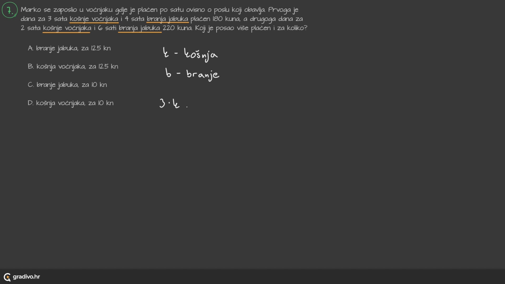 Marko se zaposlio u voćnjaku gdje je plaćen po satu ovisno o poslu koji obavlja. Prvoga jedana za 3 sata košnje voćnjaka i 4 sata branja jabuka plaćen 180 kuna, a drugoga danaza 2 sata košnje voćnjaka i 6 sati branja jabuka 220 kuna. Koji je posao više plaćen i za koliko?