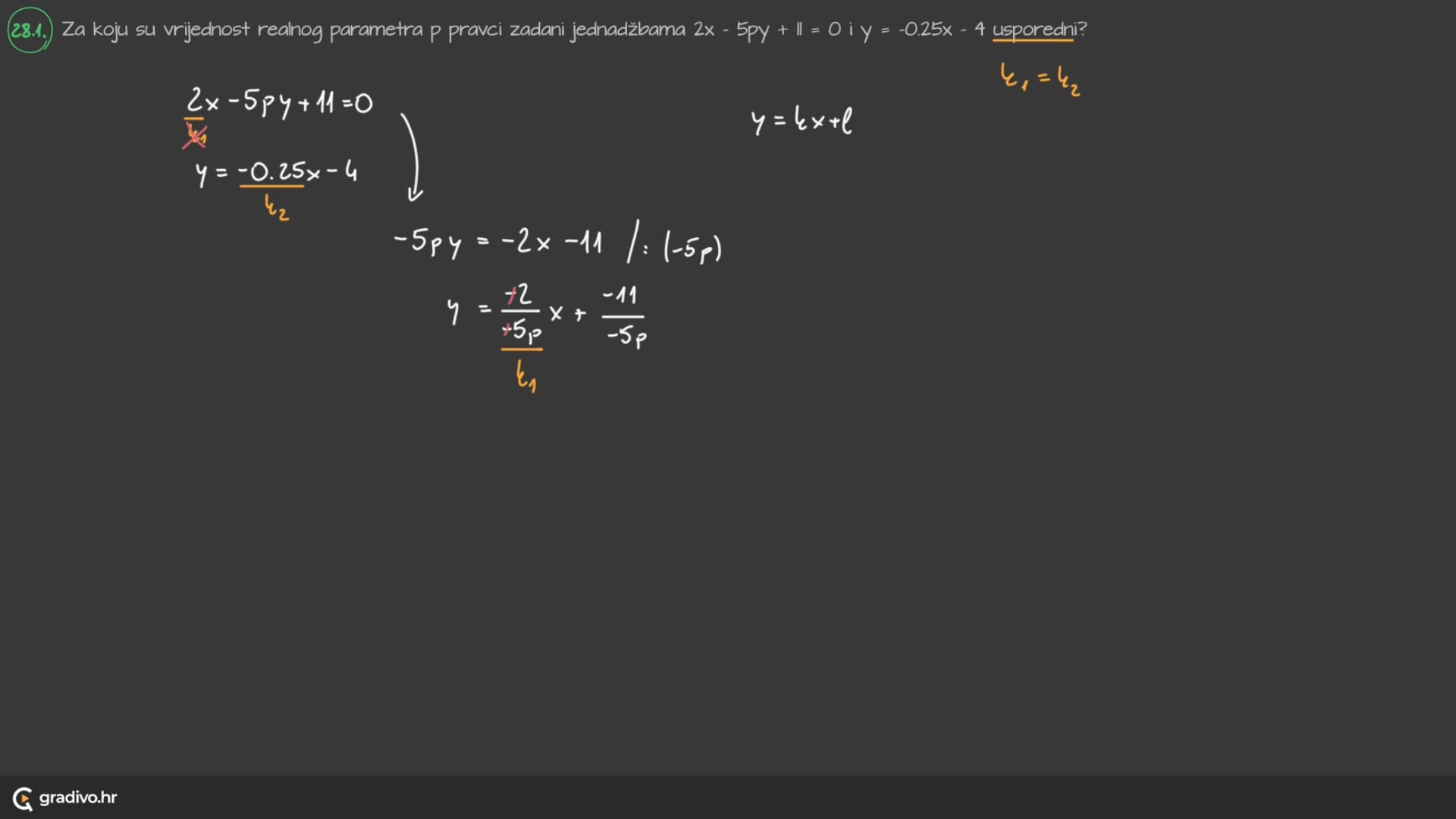 Za koju su vrijednost realnog parametra $p$ pravci zadani jednadžbama $2 x-5 p y+11=0$ i $y=-0.25 x-4$ usporedni?
