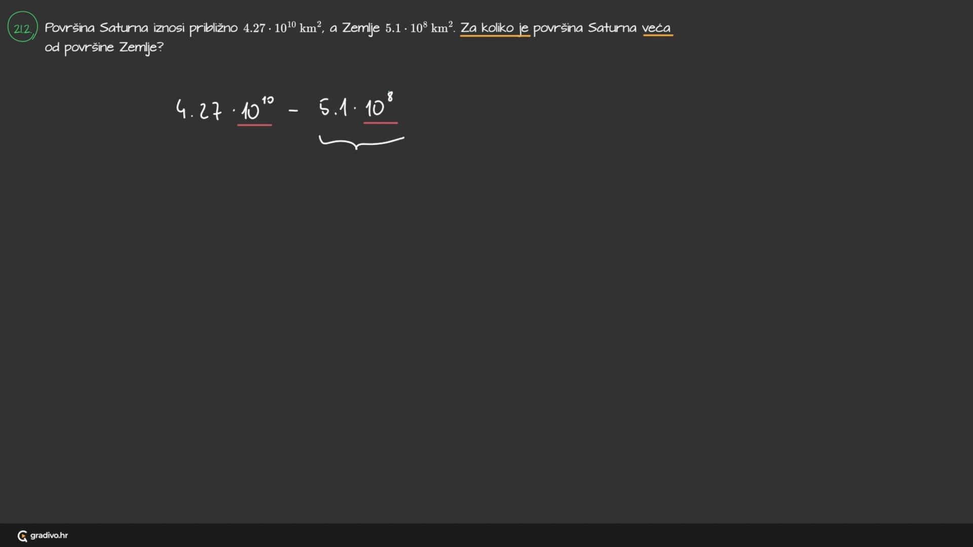 Površina Saturna iznosi pribliżno $4.27 \cdot 10^{10} \mathrm{~km}^{2}$, a Zemlje $5.1 \cdot 10^{8} \mathrm{~km}^{2}$. Za koliko je površina Saturna veća od površine Zemlje?