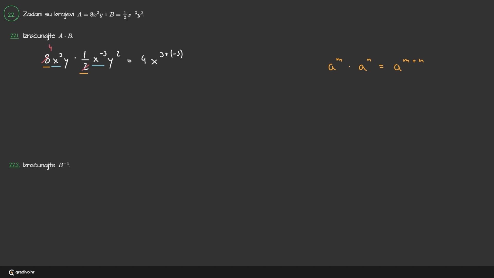 Zadani su brojevi $A=8 x^3 y$ i $B=\frac{1}{2} x^{-3} y^2$.