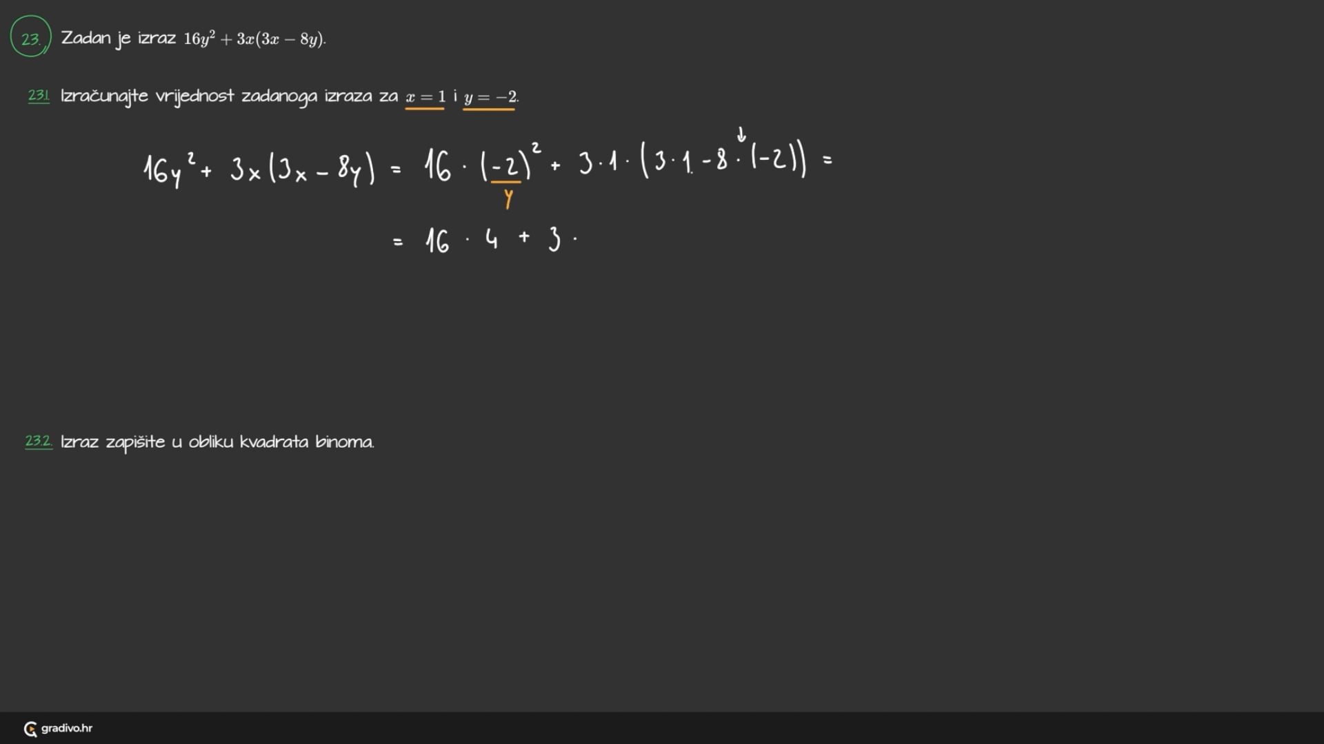 Zadan je izraz $16 y^{2}+3 x(3 x-8 y)$.