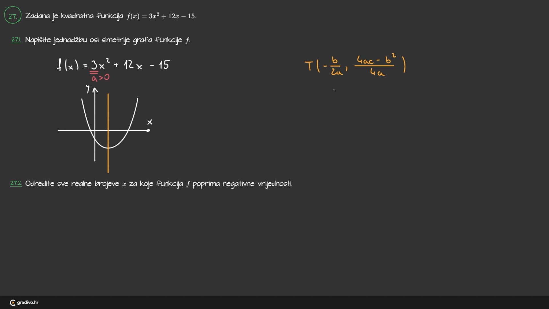 27.2. Odredite sve realne brojeve $x$ za koje funkcija $f$ poprima negativne vrijednosti.