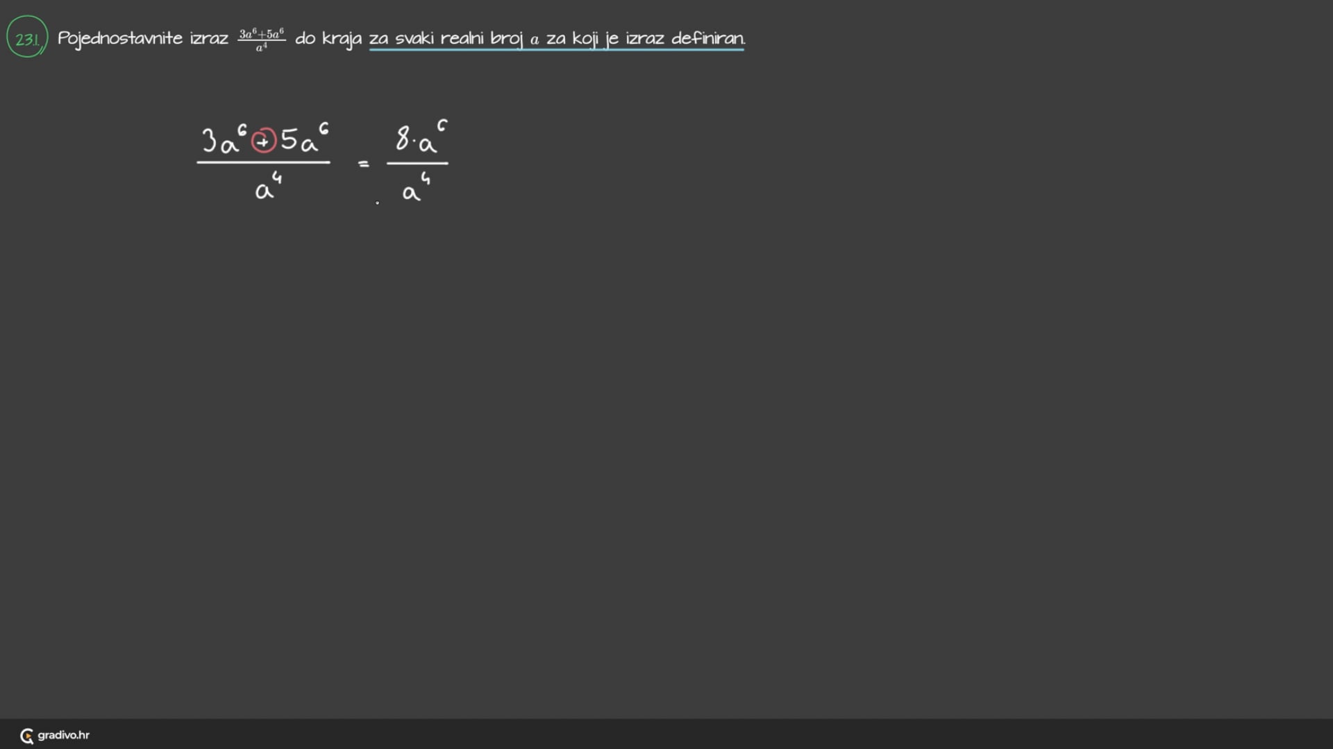 Pojednostavnite izraz $\frac{3 a^{6}+5 a^{6}}{a^{4}}$ do kraja za svaki realni broj $a$ za koji je izraz definiran.