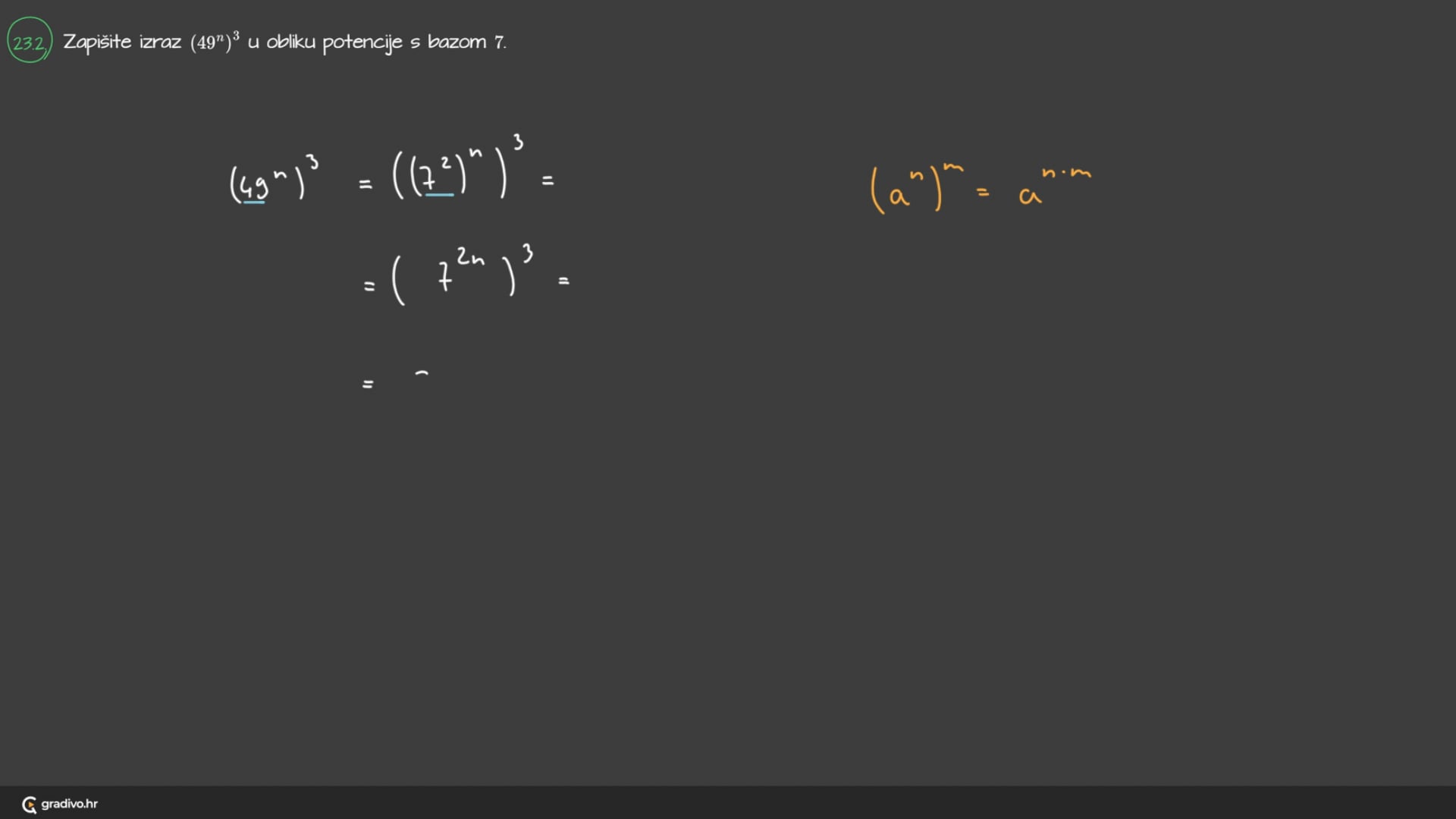Zapišite izraz $\left(49^{n}\right)^{3}$ u obliku potencije s bazom 7 .