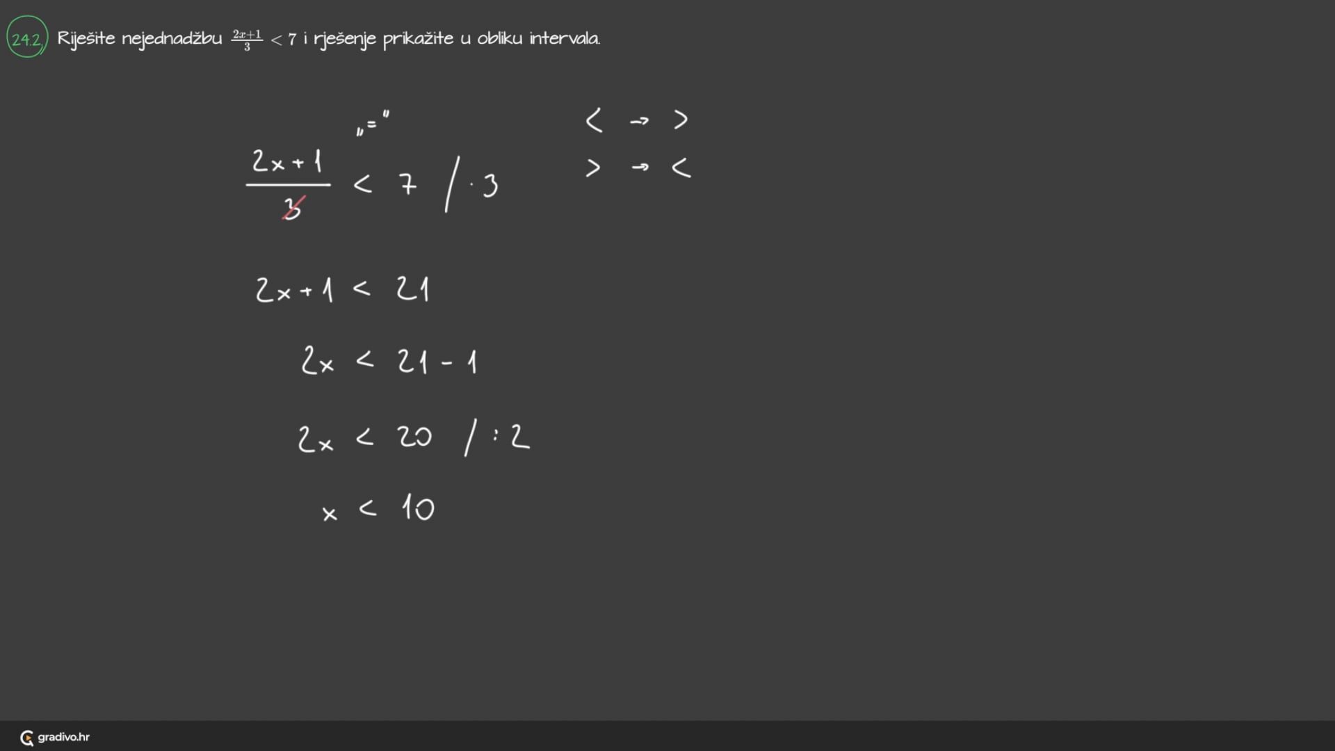 Riješite nejednadžbu $\frac{2 x+1}{3}<7$ i rješenje prikažite u obliku intervala.
