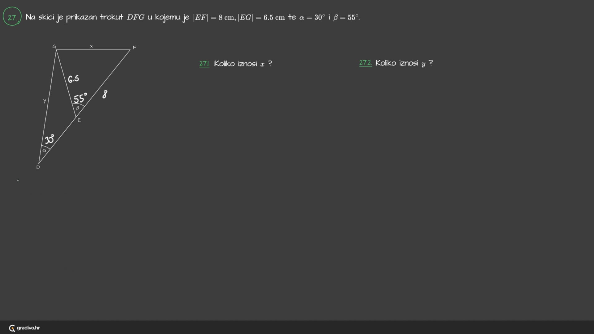 Na skici je prikazan trokut $D F G$ u kojemu je $|E F|=8 \mathrm{~cm}$, $|E G|=6.5 \mathrm{~cm}$ te $\alpha=30^{\circ}$ i $\beta=55^{\circ}$.