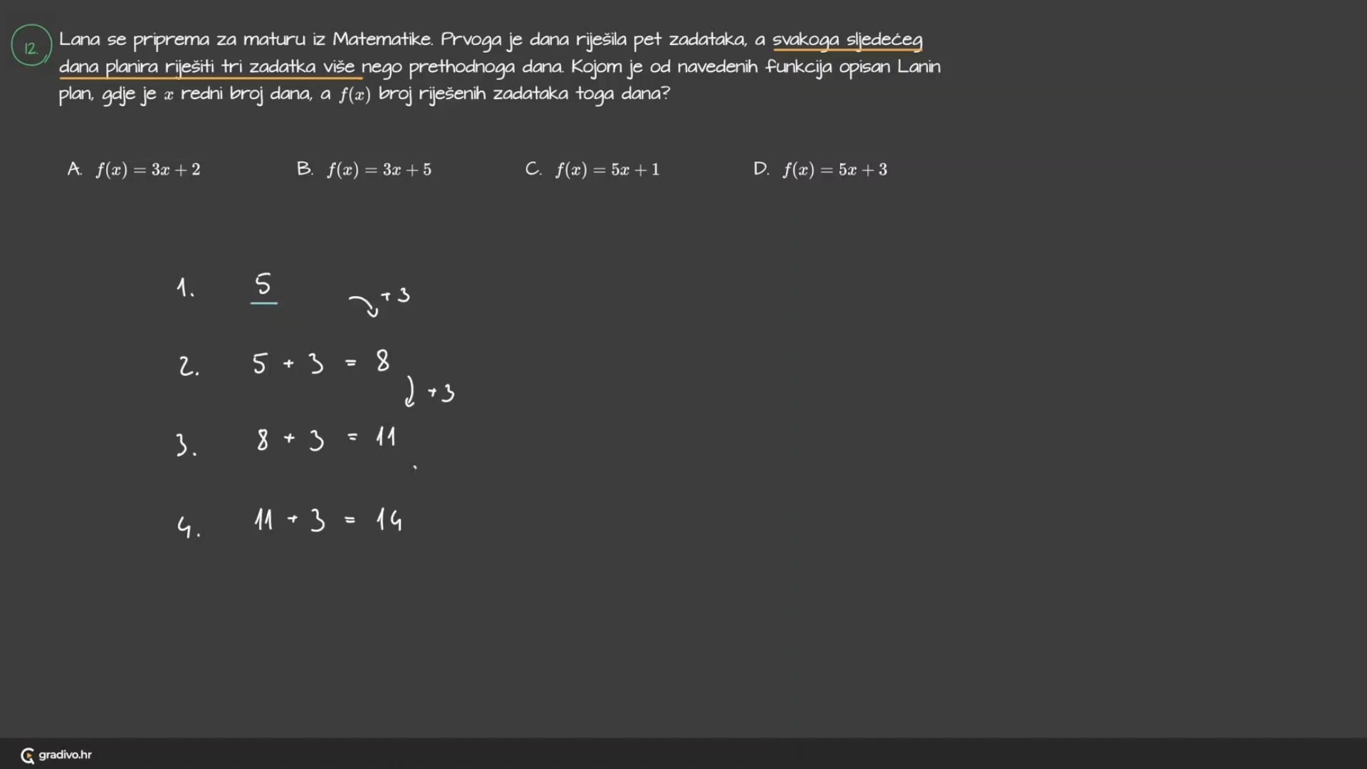 Lana se priprema za maturu iz Matematike. Prvoga je dana riješila pet zadataka, a svakoga sljedećeg dana planira riješiti tri zadatka više nego prethodnoga dana. Kojom je od navedenih funkcija opisan Lanin plan, gdje je $x$ redni broj dana, a $f(x)$ broj riješenih zadataka toga dana?